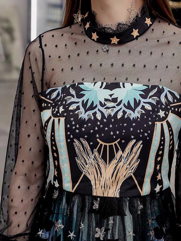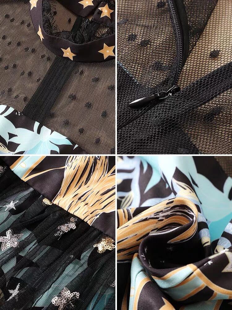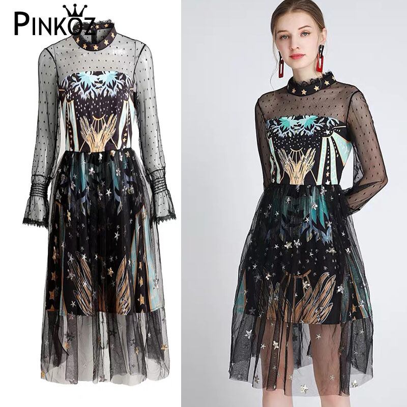 Pinkoz 黒のエレガントなパッチワーク メッシュ長袖レディ ドレス膝丈 prined パーティー ナイト スパンコール プラス サイズ ドレス vestidos ロング ピンク ブラック 大きめサイズ