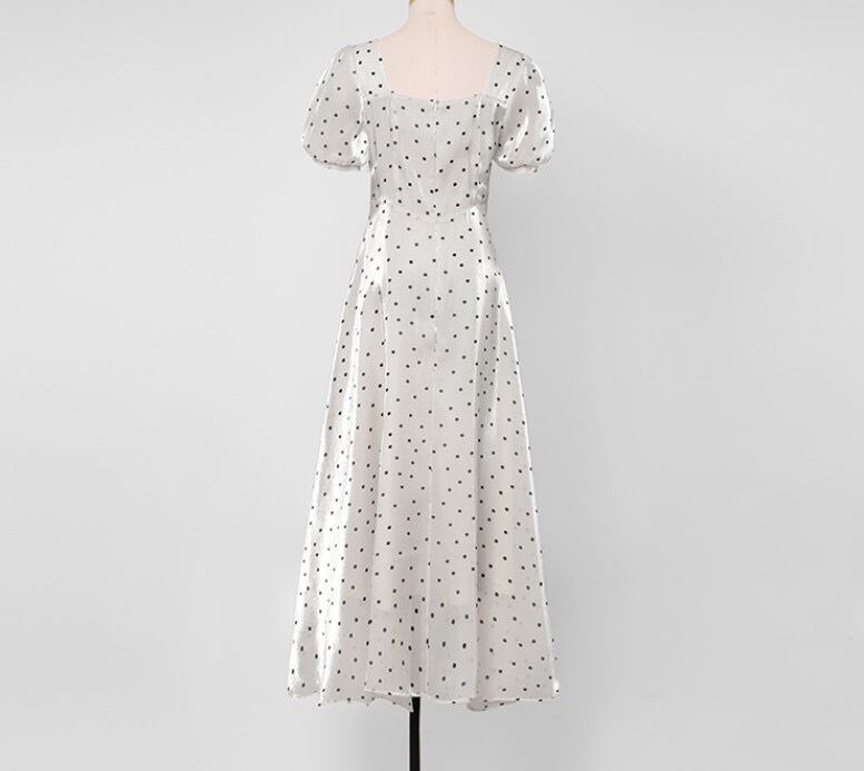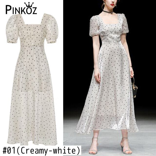 Pinkoz 水玉ドレス 夏ヘップバーン風パフスリーブドレス ウエストスリム スクエアカラー パーティー服 ピンク サマー 夏物 スクウェア