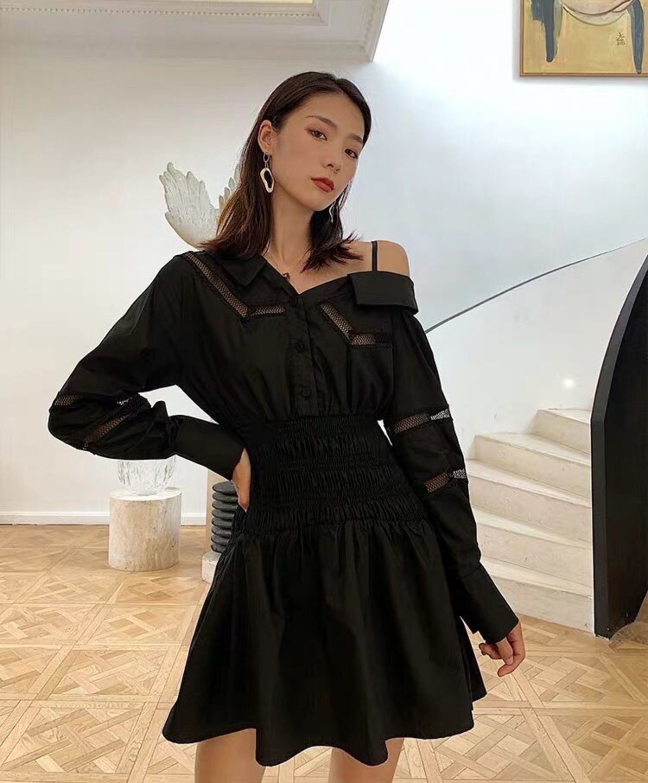 Pinkoz セレブパーティーミニドレスハイウエストワンショルダー黒ゴシックカジュアル長袖中空アウトドレス女性ローブシック ハイウェスト ロング ピンク ブラック