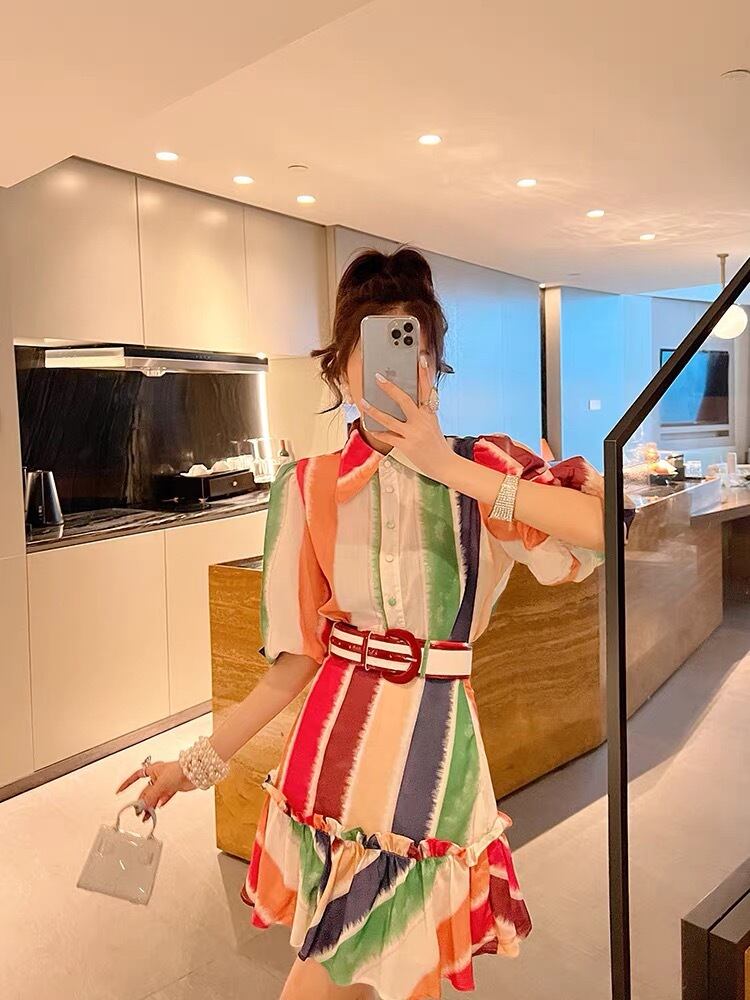 Pinkoz デザイナー スタイリッシュ レインボー カラフル ストライプ ファッション トップス 半袖 夏 シャツ ミニスカート 2点セット レディース 衣装 ショート ピンク ハーフスリーブ サマー 夏物