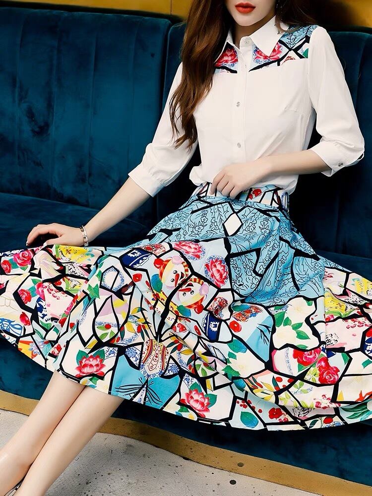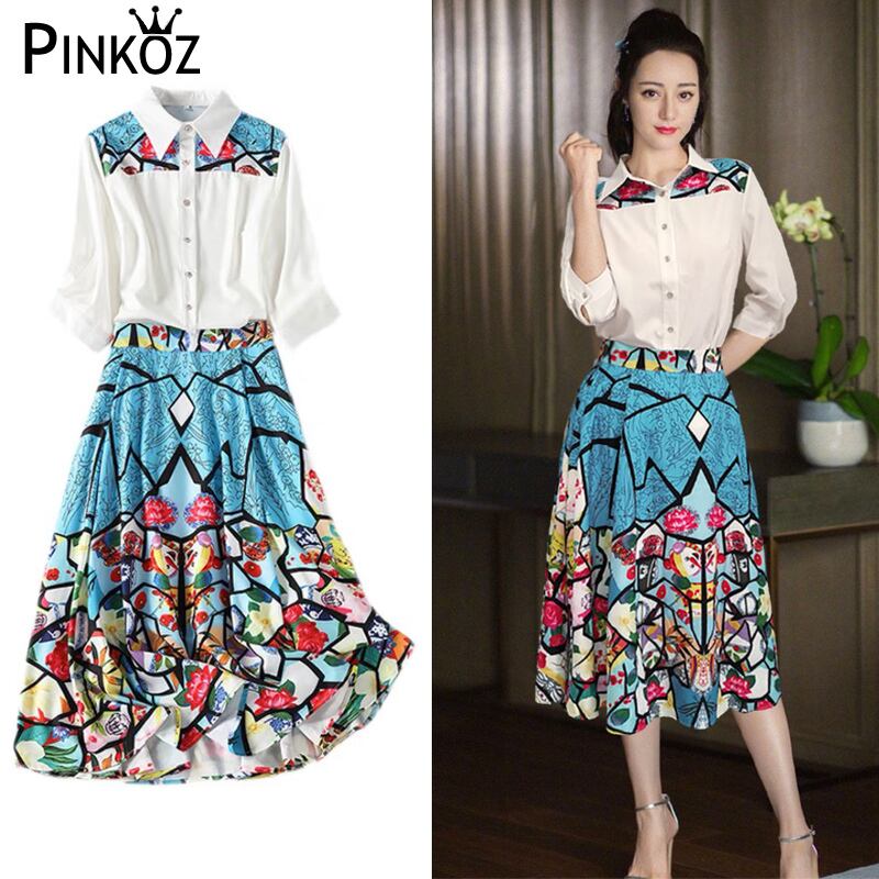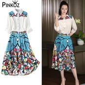 Pinkoz 滑走路デザイナー女性 2 点セット白シャツフルスリーブブラウス春ブルースカートターンダウン襟ファムカジュアルセット ピンク ホワイト スプリング 春物 フェミニン