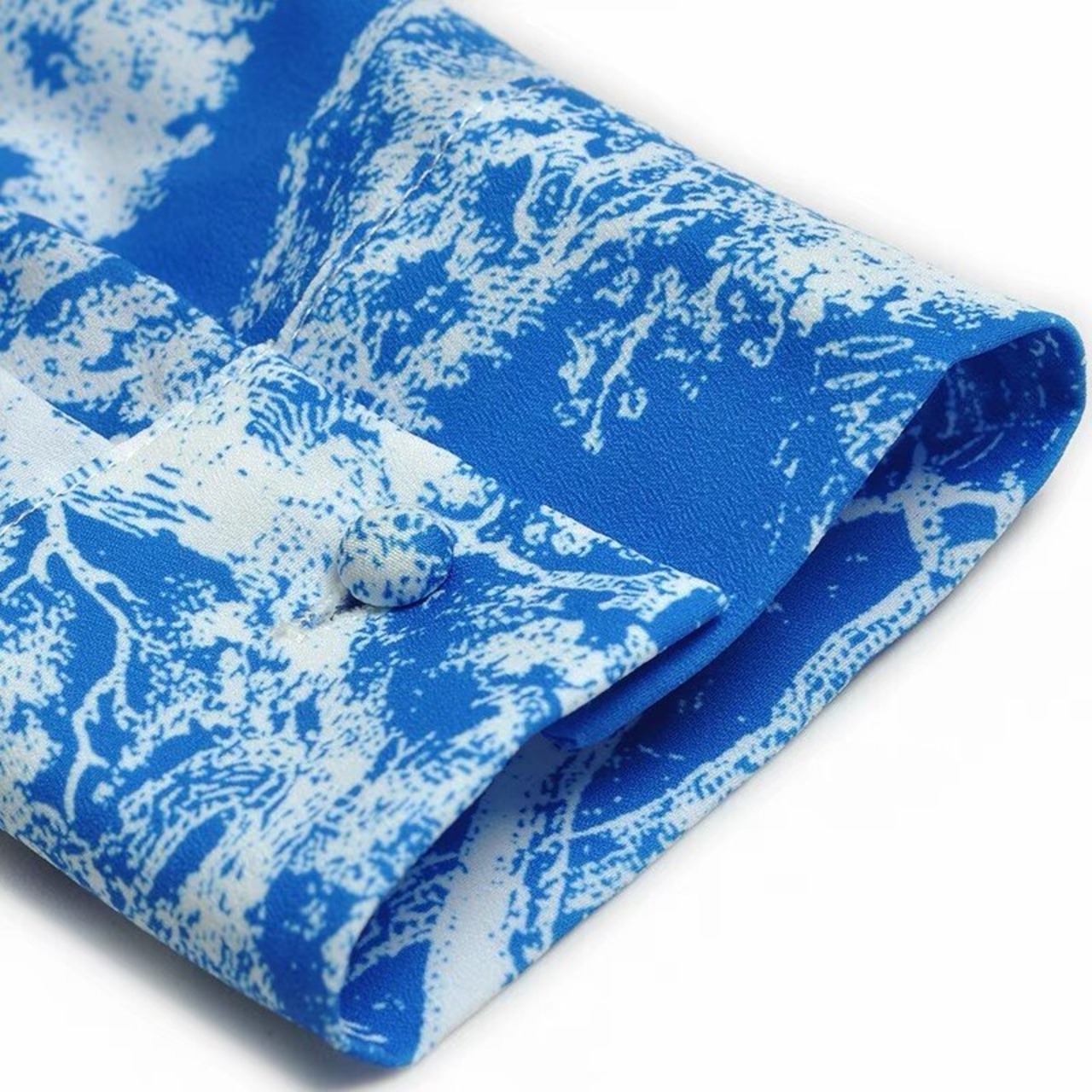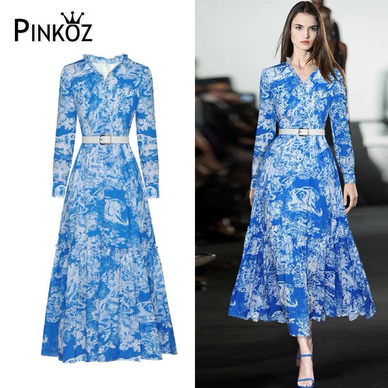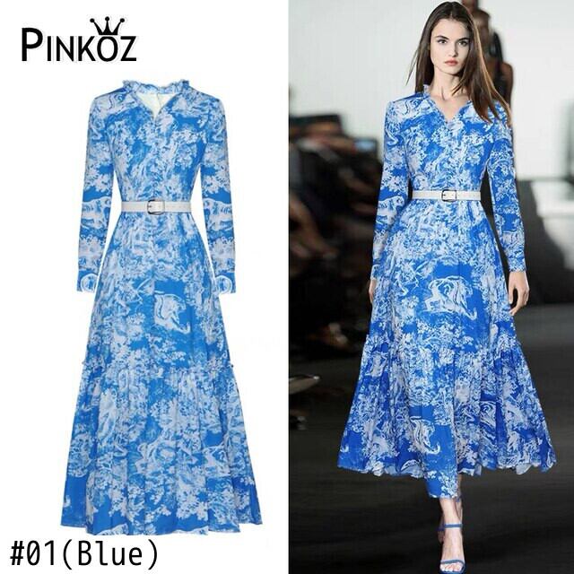 Pinkoz 女性デザイナーブルーアニマルフローラルプリント v ネックシャーリングロングドレスボタンパッチワーク春の新ファッションビッグサイズのローブ ピンク スプリング 春物 花柄 Vネック
