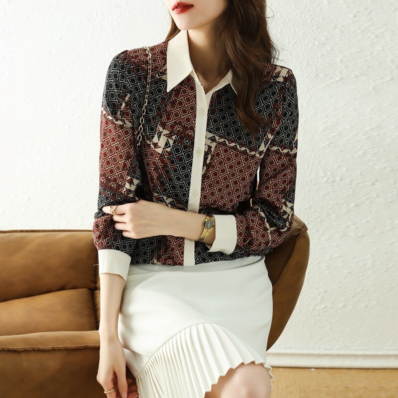 Pinkoz デザイナー女性ターンダウン襟フルスリーブチェック柄プリントオフィスレディエレガントフレンチブラウス女性トップスシャツファッション新 ピンク 会社 学校 通勤や通学にも