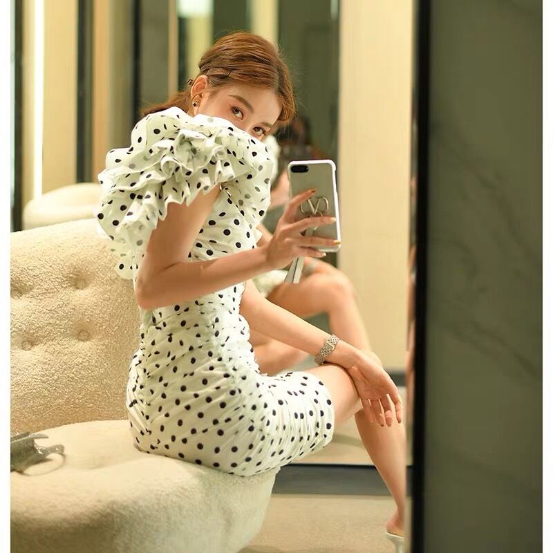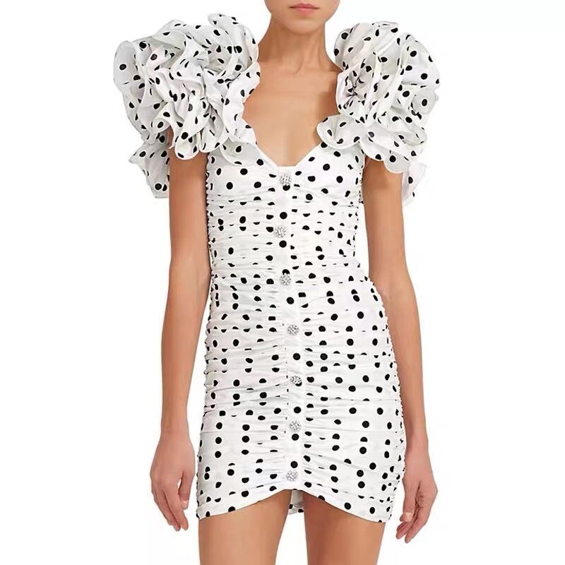 Pinkoz 有名人滑走路デザイナー スタイル水玉スリム ボディコン クリスタル ボタン フリル高級イン ミニ ドレス セクシーな女性パーティー新しい ピンク ラッフル