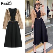 Pinkoz エレガント ヴィンテージ ベスト パッチワーク シフォン フリル 秋冬 ブラック ミディ OL ドレス ベルト付き カジュアル ファム 服 座 ピンク ラッフル オータム 秋物 ウィンター 冬物 ハーネス フェミニン ビンテージ