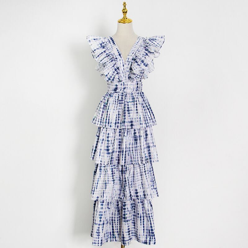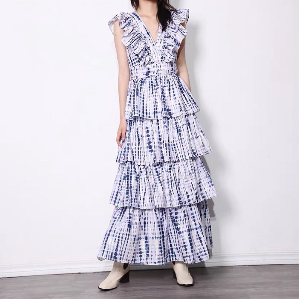 Pinkoz 滑走路デザイナー ストライプ マキシ ドレス v ネック フリル弾性待機バックレス セクシーなパーティー ロング ドレス レイヤード ローブ ピンク レッド ラッフル エラスティック 伸縮 Vネック