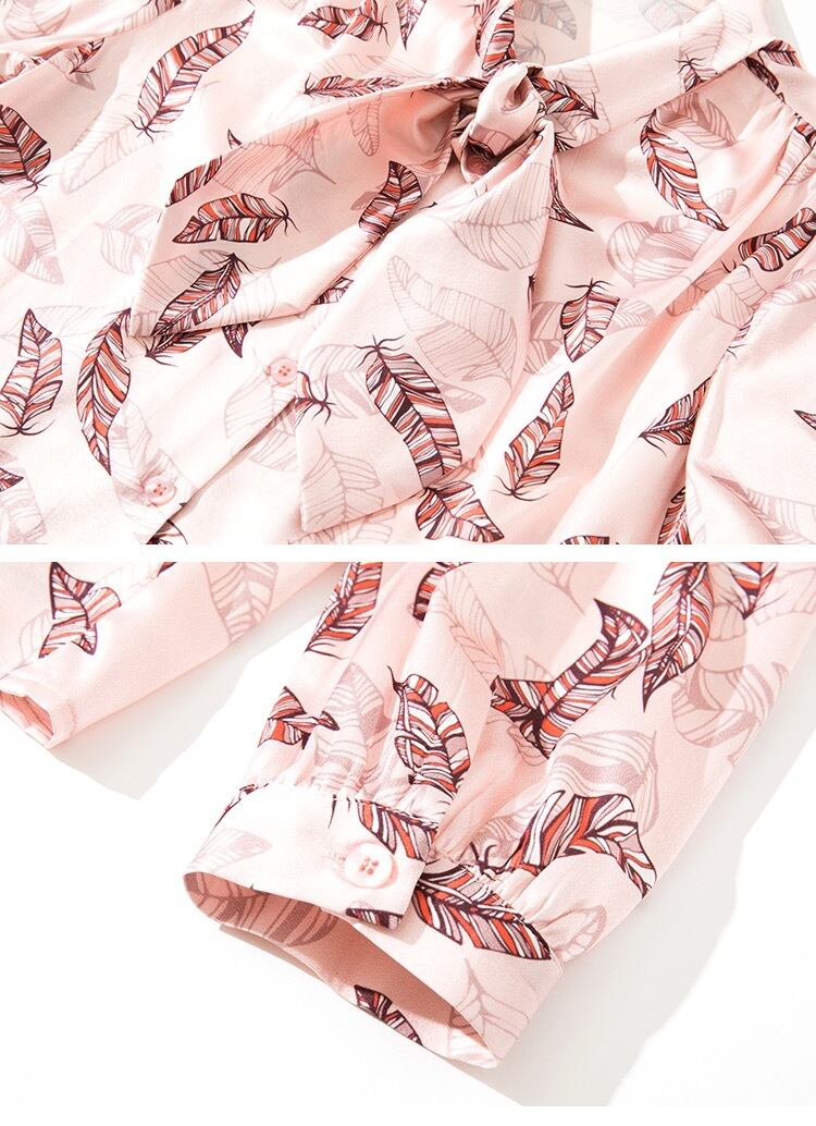 Pinkoz 滑走路デザイナー スタイリッシュなピンク リーフ プリント弓フル スリーブ ブラウス女性ファッション エレガントなヴィンテージ シャツ甘いトップス女性座 リボン 大人ガーリー スウィート キュート カジュアル ビンテージ