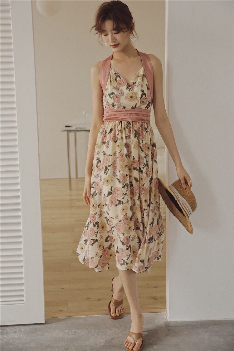 Pinkoz ホルター ドレス夏ロング ミディ A ライン デイジー花ドレス女性ノースリーブ Flowy スリップ ドレス ホリデー ローブ ファム ピンク サマー 夏物 花柄 Aライン フェミニン