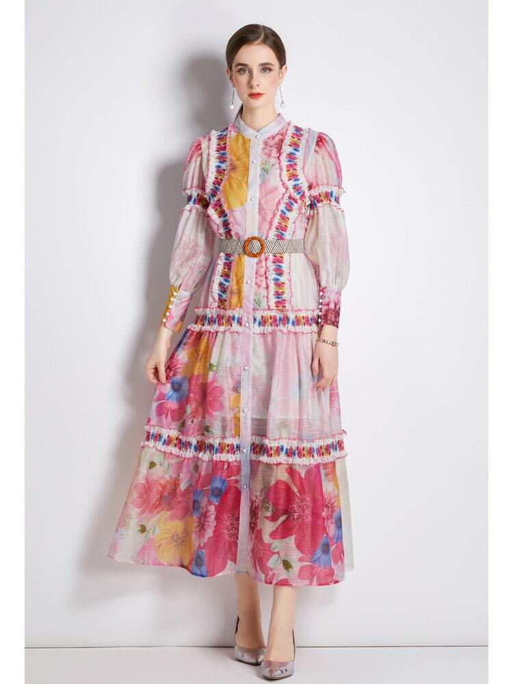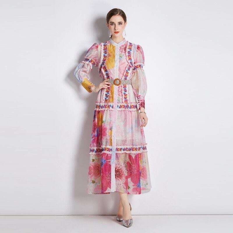 Pinkoz ランウェイ デザイナー マキシドレス ピンク フローラル プリント シングル ブレスト ランタン スリーブ 秋冬 ドレス リッチ ランタンスリーブ オータム 秋物 花柄
