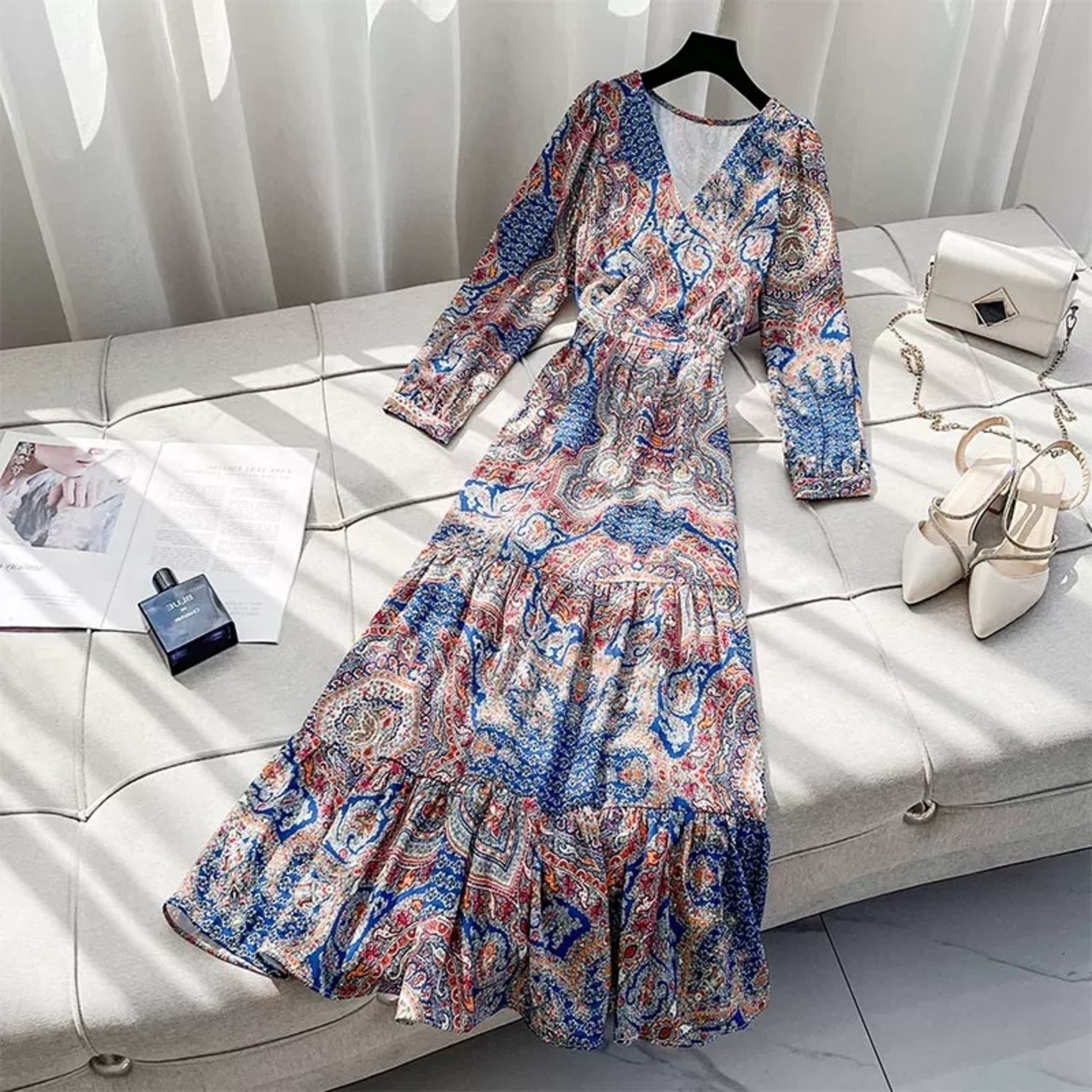 Pinkoz 女性ヴィンテージレトロフラワープリント v ネック春秋ロングドレスカジュアル弾性 wasit ルーズサイズ vestidos デ mujer za ピンク エラスティック 伸縮 スプリング 春物 オータム 秋物 Vネック フラワーデザイン ビンテージ