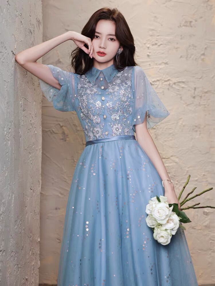 Pinkoz 膝丈メッシュ ライトブルー ドレス ターン ダウン カラー パフ スリーブ ハイ ウエスト スパンコール パーティー スイート フェアリー フレンチ ヴィンテージ ドレス ハイウェスト ピンク 大人ガーリー スウィート キュート カジュアル ビンテージ