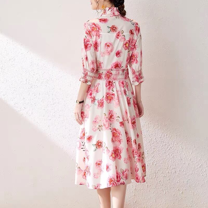 Pinkoz セレブフラワープリントシャーリングスタンドカラー女性ミディドレス弾性ウエストレースアップシフォンホリデーファムカイローブ mujer ピンク エラスティック 伸縮 フェミニン フラワーデザイン