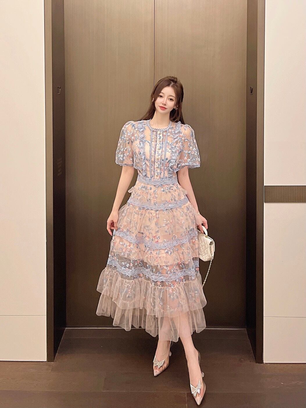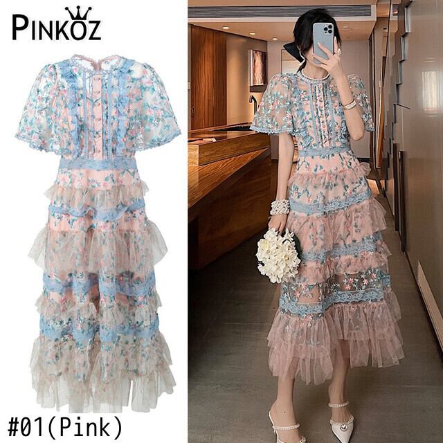 Pinkoz 滑走路デザイナー パーティー ナイト ミディ ロング ドレス カスケード フリル レース刺繍半袖ドレス vestidos ヴィンテージ za ショート ピンク ハーフスリーブ ラッフル ビンテージ