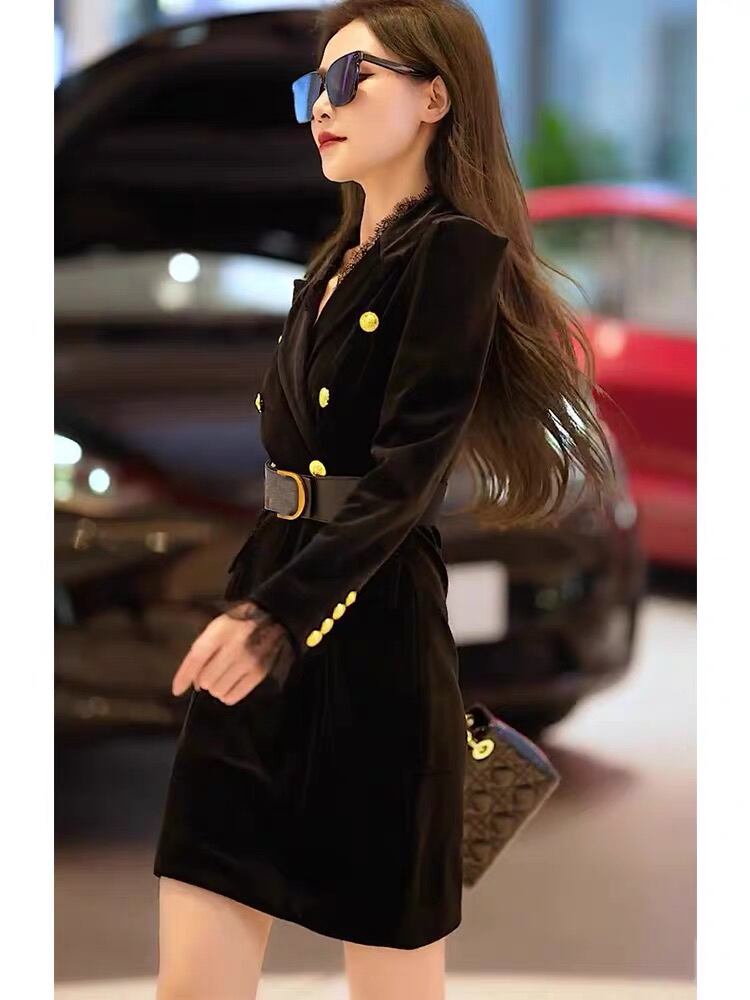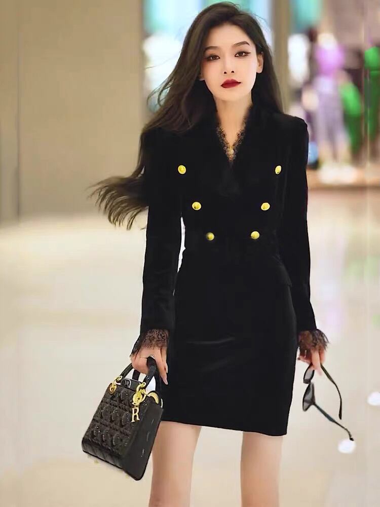 Pinkoz 滑走路デザイナー ミニドレス黒パッチワーク レース ダブル ブレスト ノッチ ベルベット パーティー秋冬 vestidos ヴィンテージ ピンク ブラック オータム 秋物 ウィンター 冬物 ビンテージ