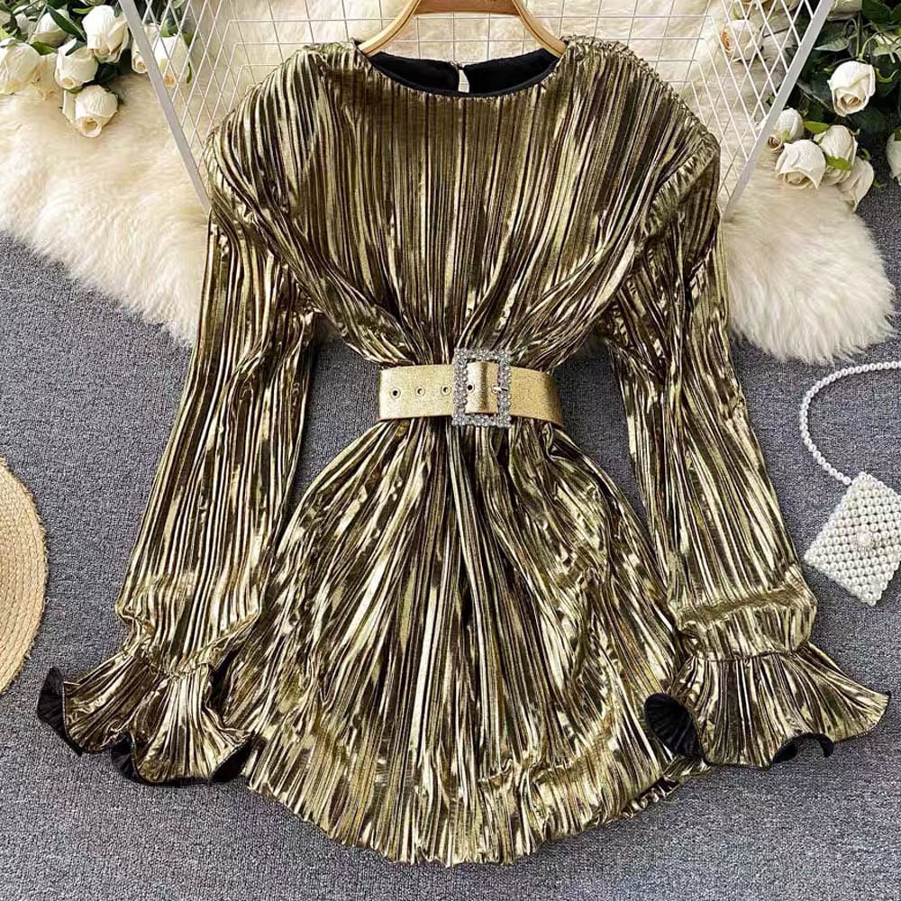 Pinkoz 滑走路デザイナー シルバー グリッター O ネック フリル ミニ パーティー ドレス女性ハイウエスト フル スリーブ ドレス ベルト ヴィンテージ ハイウェスト ピンク ハーネス Oネック 銀 ビンテージ