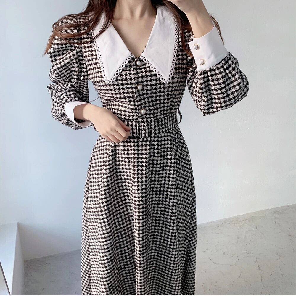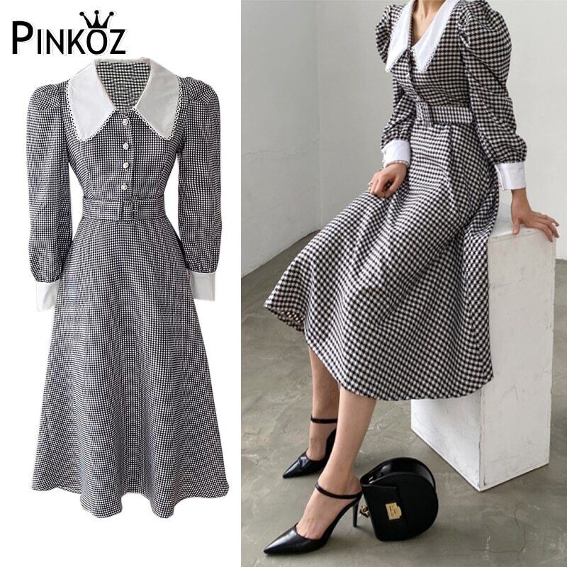 Pinkoz エレガントなファッション ピーターパン襟チェック柄ミディ ドレス パフ スリーブ秋冬作業服 vestidos デ verano mujer ピンク オータム 秋物 ウィンター 冬物