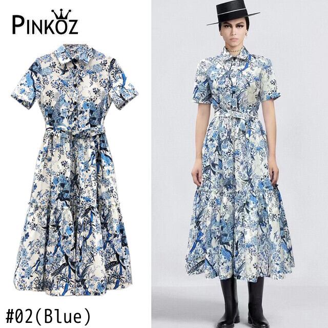 Pinkoz 夏の新しいファッション ベージュ花柄プリント ターン ダウン襟パッチワーク A ライン エレガントなローブ デ mujer とベルト vestidos traf ピンク サマー 夏物 ハーネス Aライン