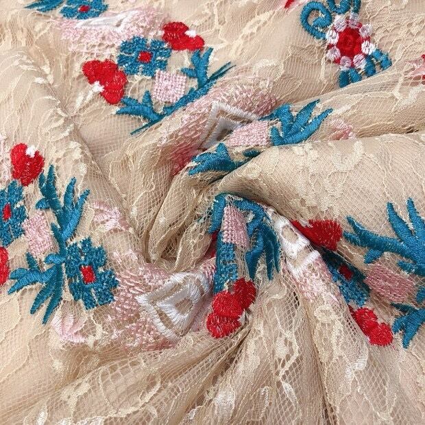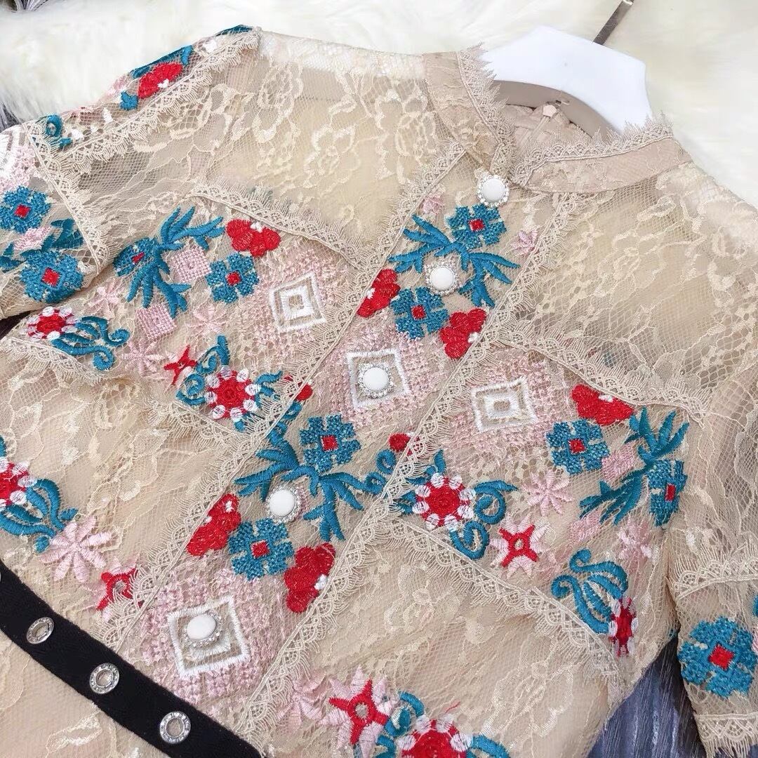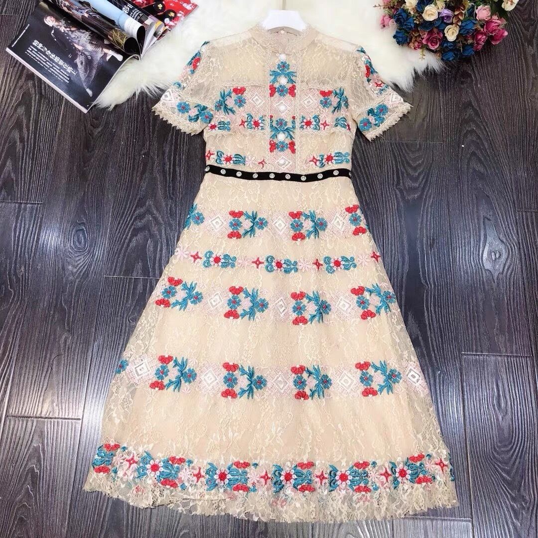 Pinkoz 高級花刺繍ミディドレスエレガントなスタンドカラー夏半袖ハイウエストボタンパーティードレス vestidos za ハイウェスト ショート ピンク ハーフスリーブ サマー 夏物 フラワーデザイン