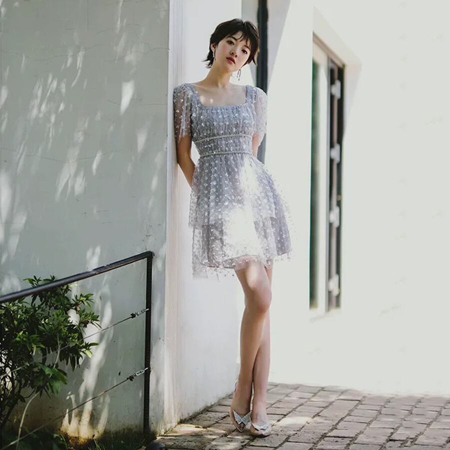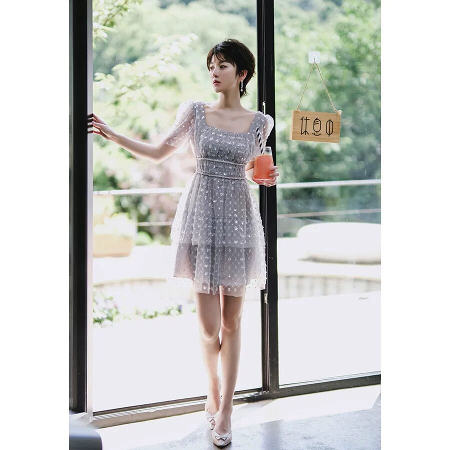 Pinkoz 滑走路デザイン ミニドレス レース スパンコール スクエア カラー パフ スリーブ グレー クリスタル ラグジュアリー パーティー 誕生日ドレス ピンク スクウェア