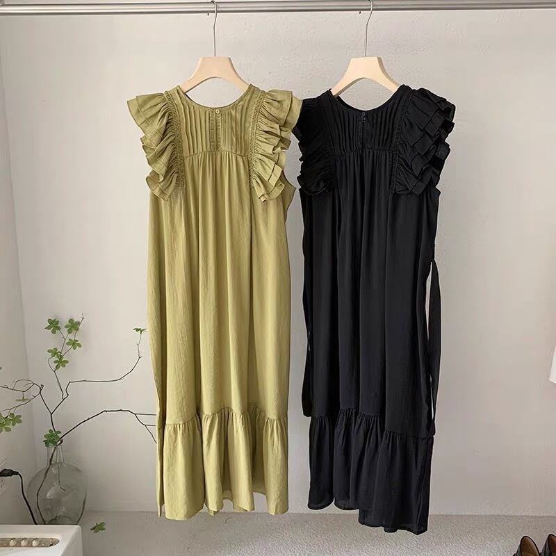 Pinkoz 女性カジュアルグリーン O ネックバタフライスリーブフリルルースミディドレス女性の夏休み自由奔放に生きるローブ vestidos traf ピンク ラッフル サマー 夏物 Oネック