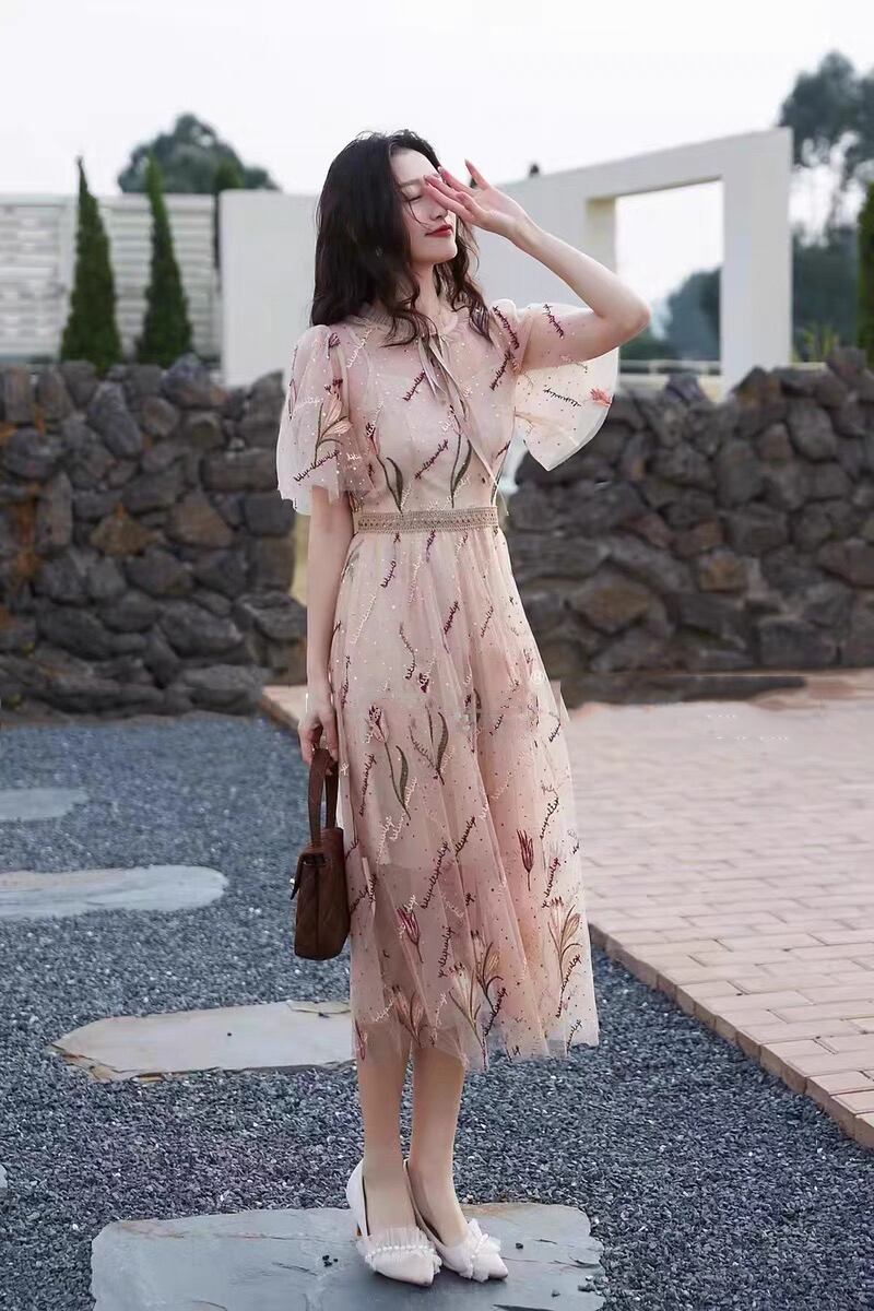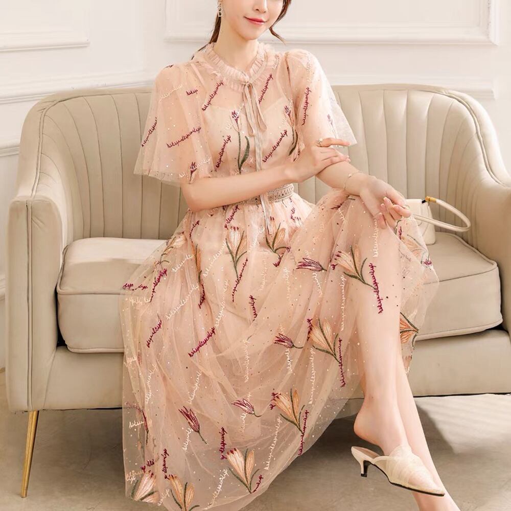 Pinkoz デザイナー女性ドレス手紙刺繍メッシュ妖精ドレス ベージュ A ライン レースアップ ファッション パーティー ドレス ルーズ サイズ vestidos ピンク Aライン