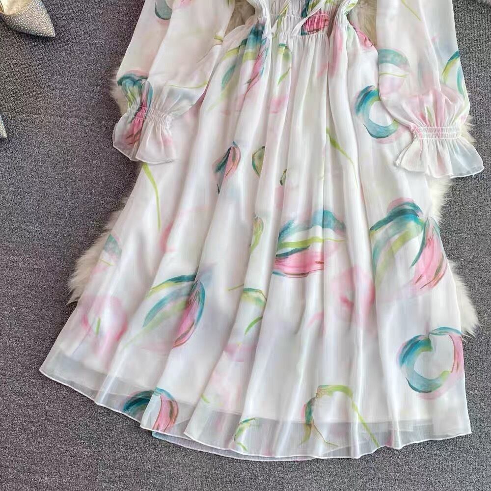 Pinkoz 女性休日夏シフォンスクエアカラー長袖ミニドレス甘い妖精ミディナイトドレスローブデ mujer traf ロング ピンク 大人ガーリー スウィート キュート カジュアル サマー 夏物 スクウェア