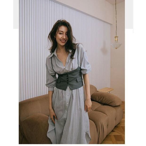 Pinkoz デザイナーカジュアル女性ミディドレスシャツストライプターンダウン襟ハイストリートシングルブレストブラウスベスト 2 個ドレス ピンク