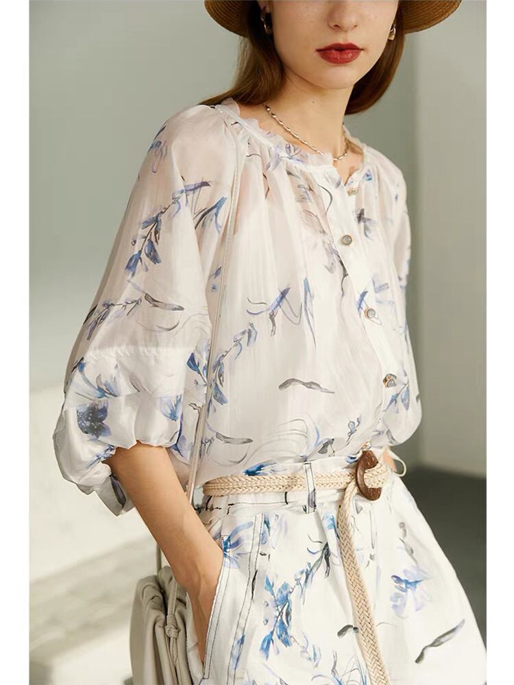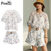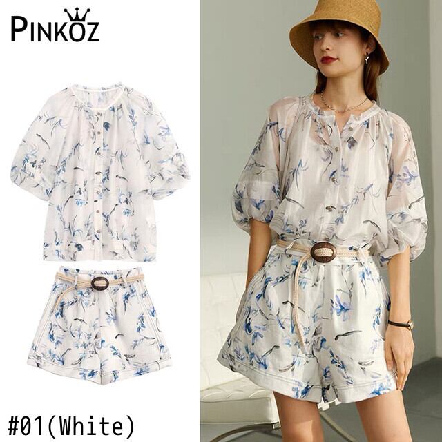 Pinkoz 女性 2 点セット夏白花柄プリント半袖ブラウストップス夏ショーツパンツ衣装カジュアル服シック ピンク ホワイト ハーフスリーブ サマー 夏物 ブルマー