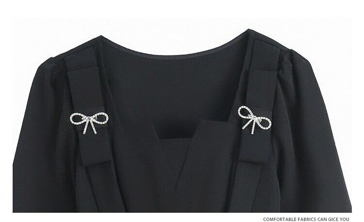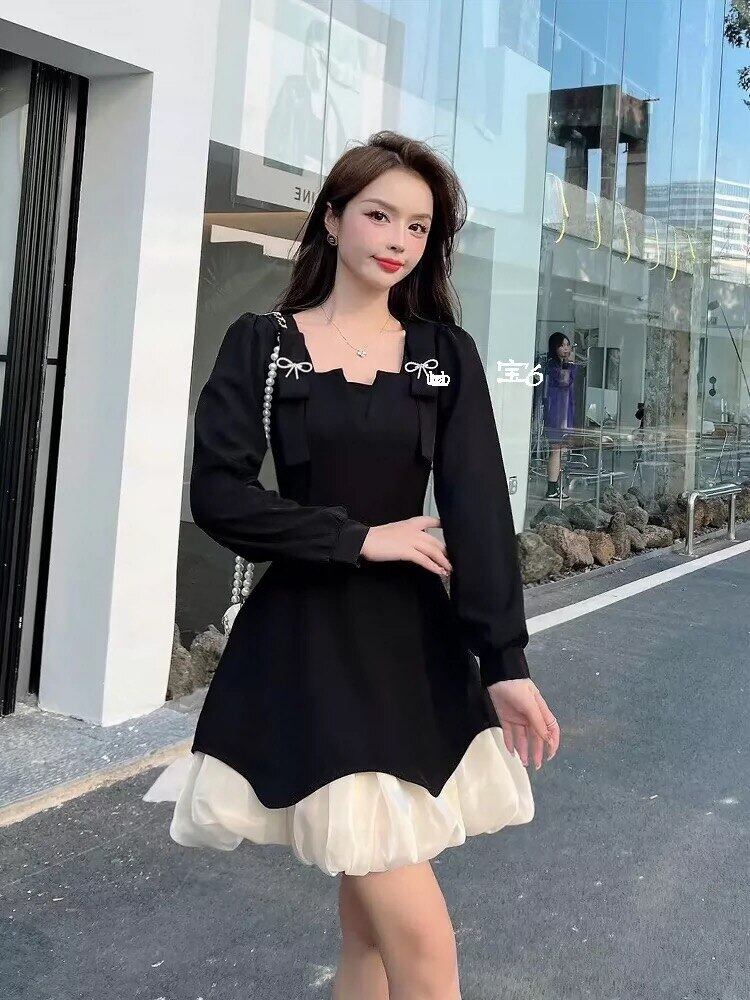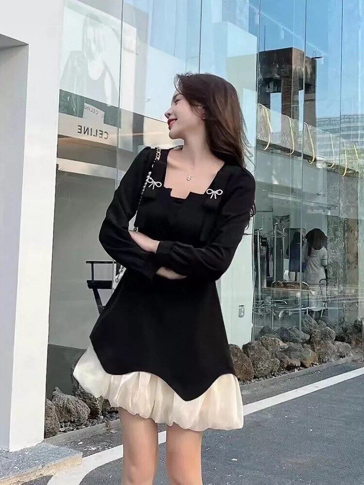 Pinkoz パッチワーク白パフ夜会服ミニ黒ドレス スクエア クリスタル弓長袖秋冬ドレス vestidos ヴィンテージ za ロング ピンク ホワイト ブラック リボン オータム 秋物 ウィンター 冬物 スクウェア ビンテージ