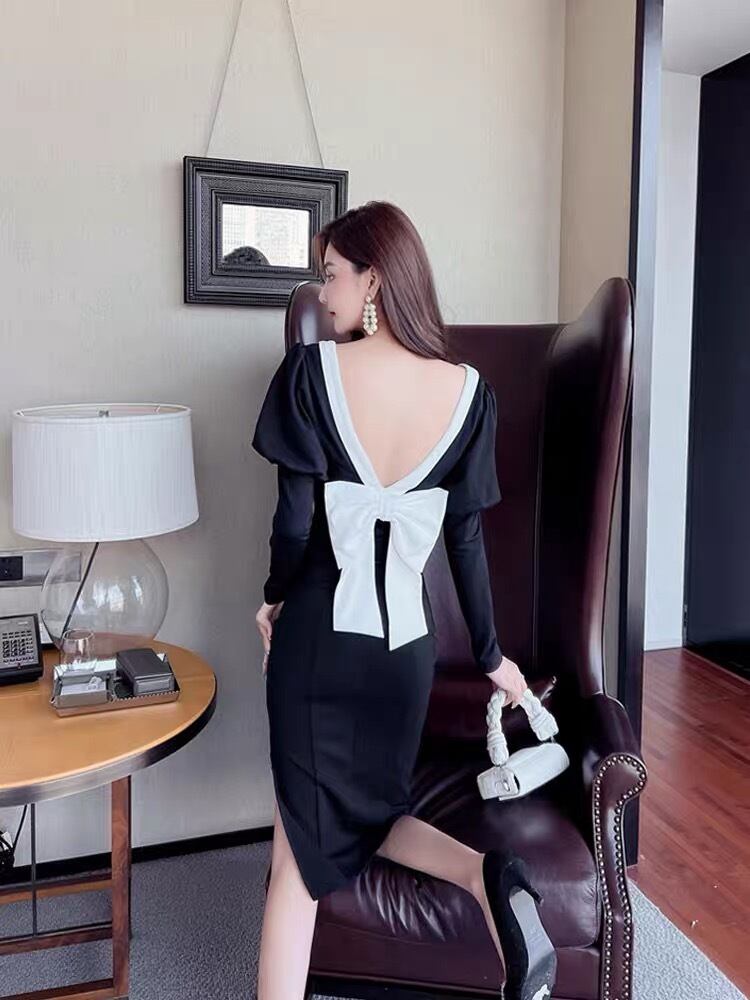 Pinkoz 黒スクエア襟春秋ミニ ペンシル ドレス背中の開いた蝶ネクタイ デザイナー シックな女性ファッション服 vestidos traf ピンク ブラック リボン スプリング 春物 オータム 秋物 スクウェア