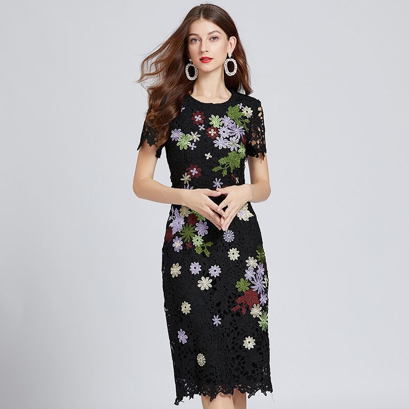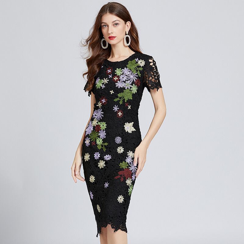 Pinkoz 花刺繍 o ネック半袖鉛筆ぬるぬるミディ ドレス黒パーティー高級誕生日夜 vestidos ショート ピンク ブラック ハーフスリーブ Oネック フラワーデザイン