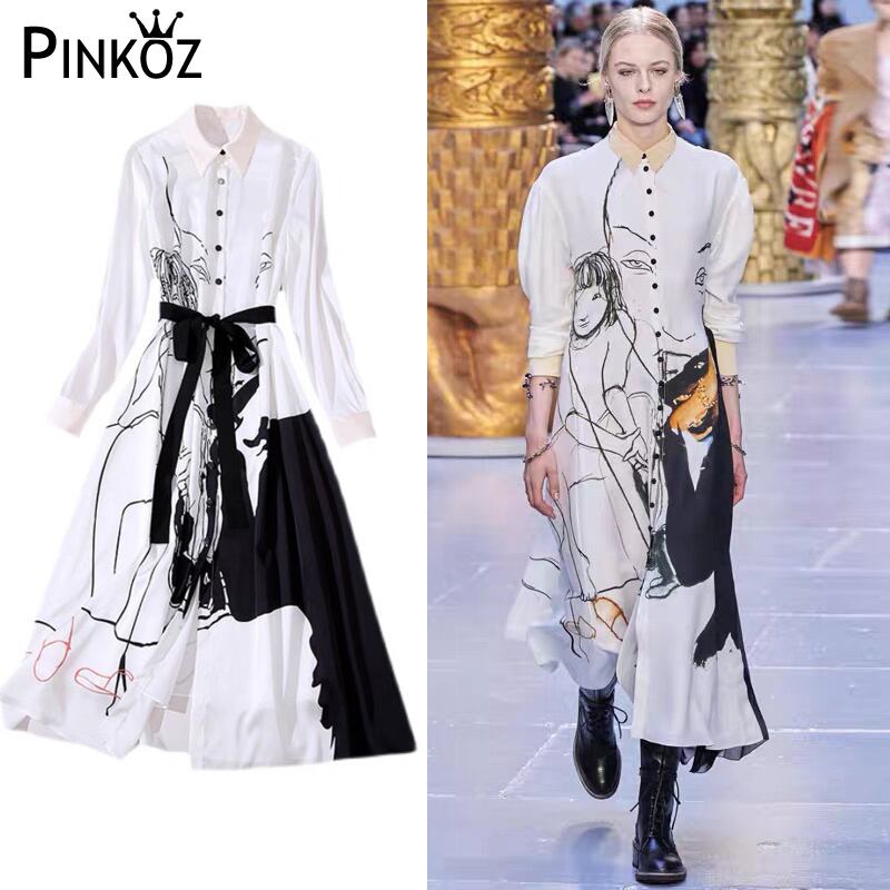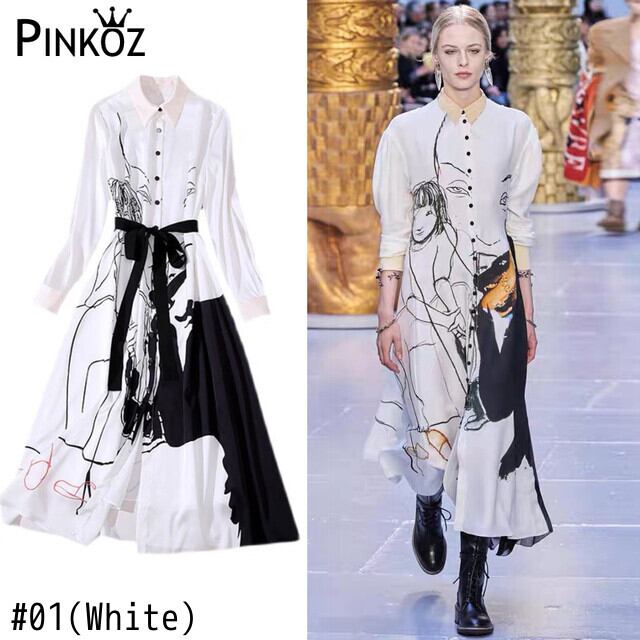 Pinkoz 滑走路デザイナーシャツミディドレス長袖春秋白墨画プリント女性プラスサイズ大 2xl ドレス ロング ピンク ホワイト 大きめサイズ スプリング 春物 オータム 秋物