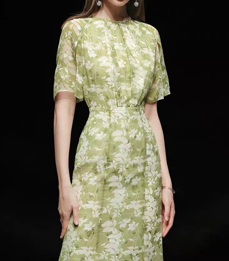 Pinkoz ファッション服グリーンフローラルプリントバタフライスリーブ夏シフォンミディドレスエレガントなシックなローブ夏のドレスの女性 ピンク サマー 夏物 花柄
