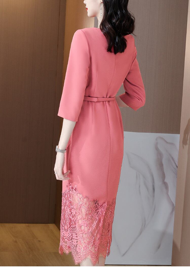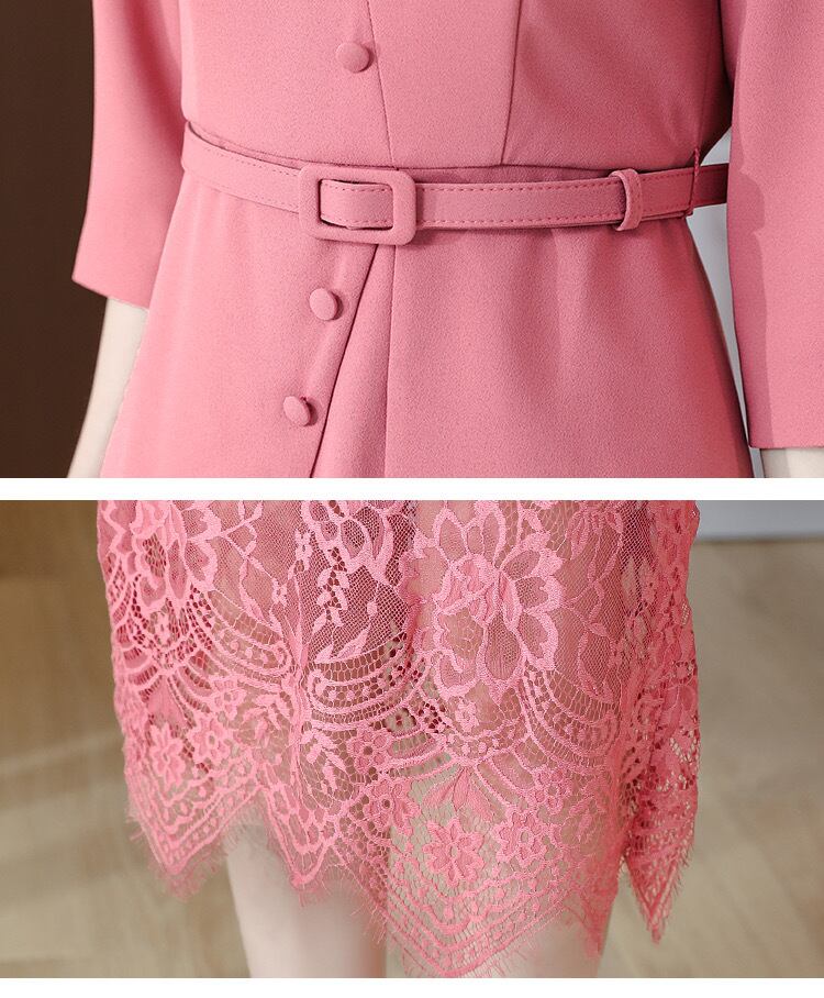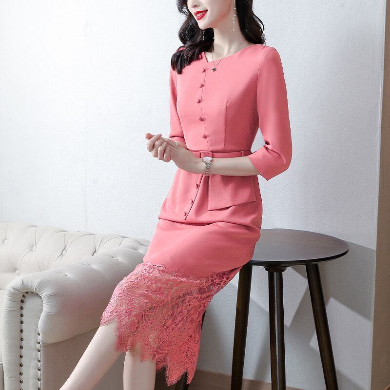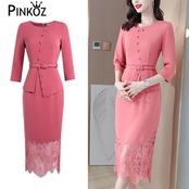 Pinkoz エレガントなピンク オフィス レディー春秋新ファッション ミディ ドレス パッチワーク レース ペンシル ビッグ sizevestidos es パラ mujer スプリング 春物 オータム 秋物 会社 学校 通勤や通学にも