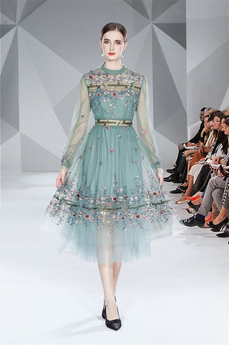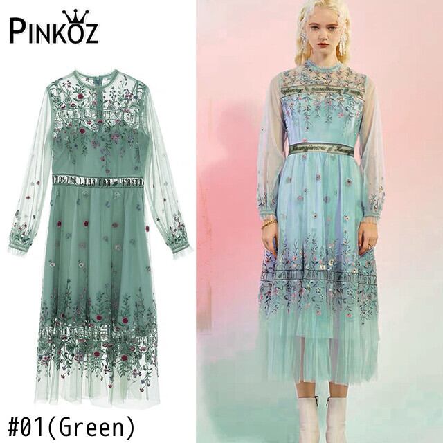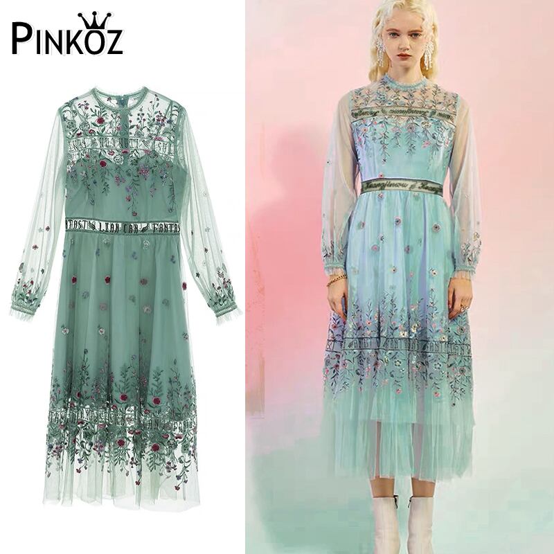 Pinkoz 滑走路デザイナー グリーン花刺繍メッシュ パッチワーク中空アウト パーティー ヴィンテージ vestidos ローブ デ mujer ピンク フラワーデザイン ビンテージ