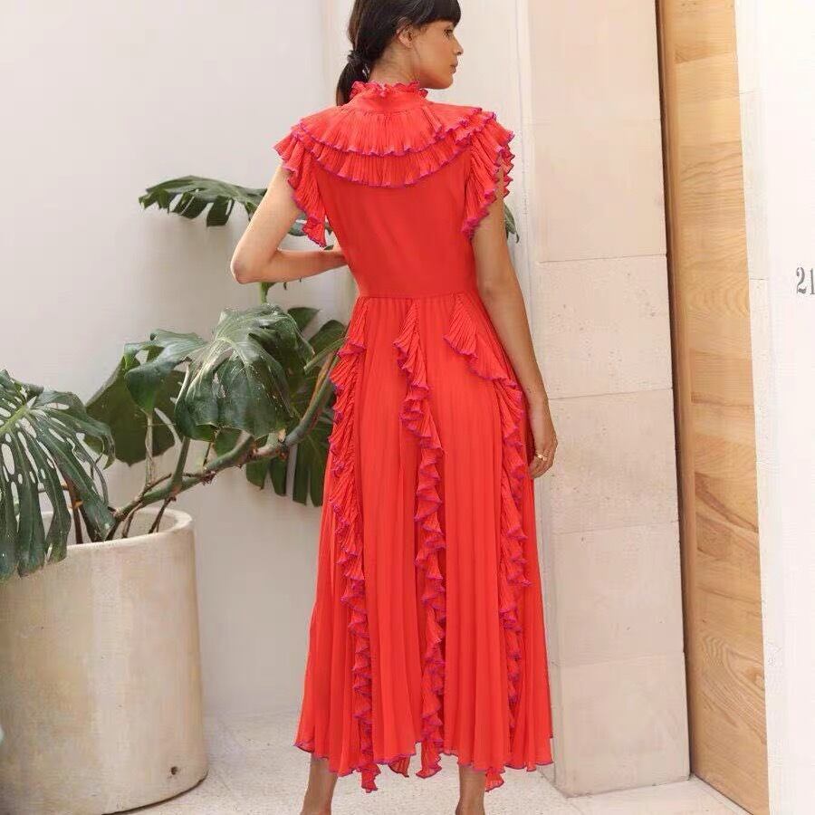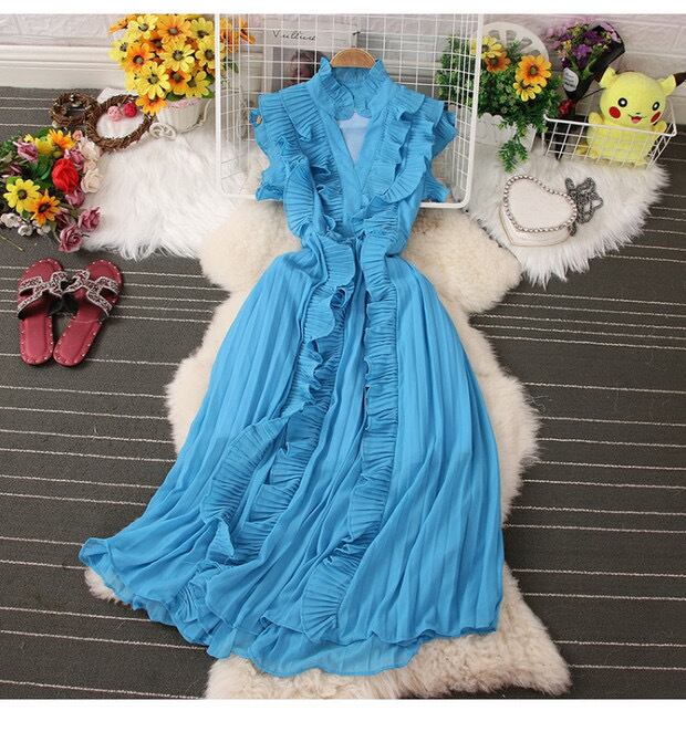 Pinkoz 女性プリーツ フリル デザイン新しい ファッション黄色 v ネック ロング ドレス パーティー エレガント ローブ デ mujer ナイト ノースリーブ vestidos ピンク ラッフル Vネック