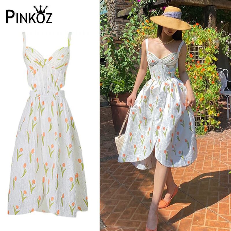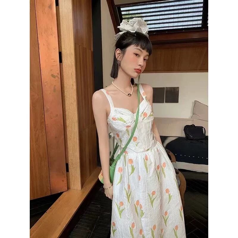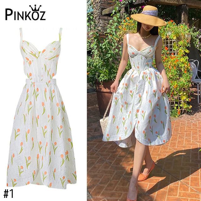 Pinkoz レディース ツーピース シチリア セット ビーチ ホリデー サマー スパゲッティ ストラップ クロップ トップ + ミディ スカート ストリート ウェア アウトフィット ピンク 夏物