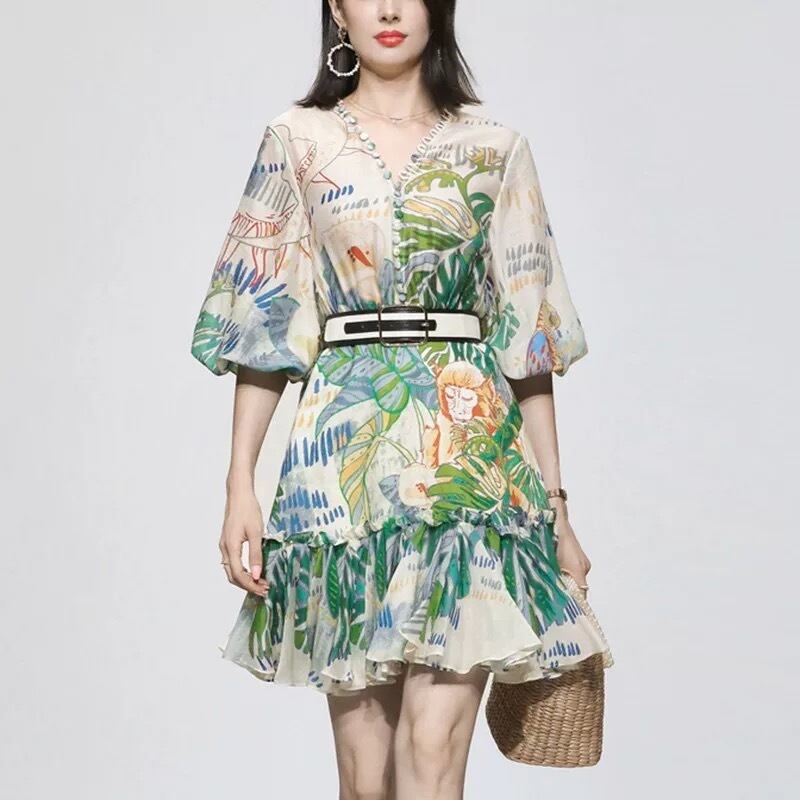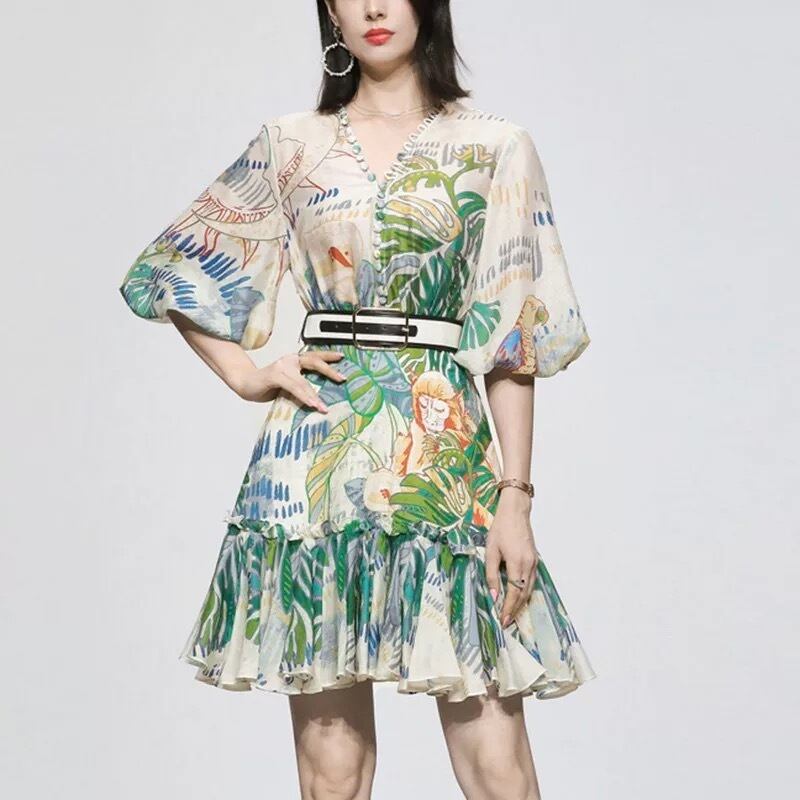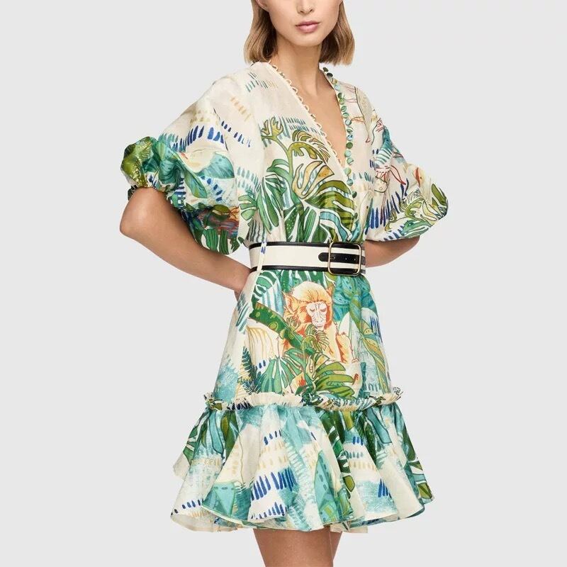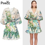 Pinkoz 夏 V ネック シングル ブレスト ミニ ドレス女性ショート パフ スリーブ ベルト スリム オフィス プリント ドレス ピンク サマー 夏物 ハーネス Vネック 会社 学校 通勤や通学にも