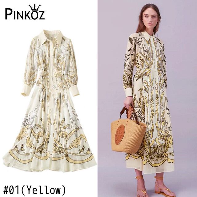 Pinkoz ヴィンテージ エレガントな女性ミディ ドレス花柄 tuen ダウン襟長袖春秋の女性エレガントな OL vestidos ローブ ロング ピンク スプリング 春物 オータム 秋物 ビンテージ