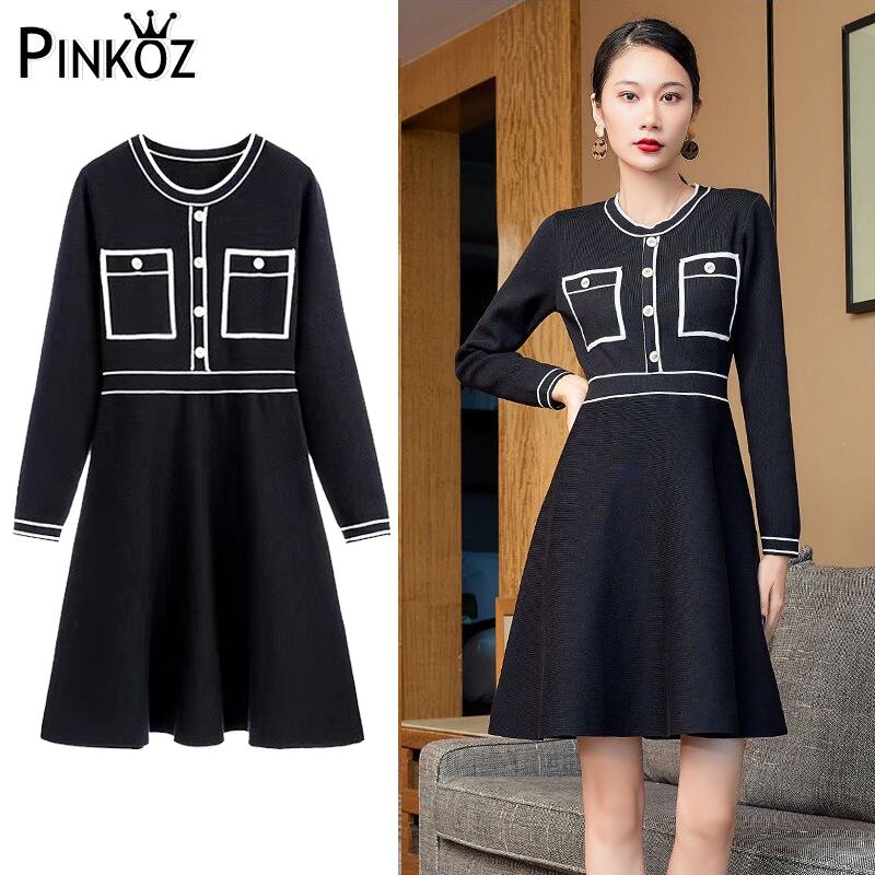 Pinkoz エレガント ヴィンテージ ベスト Oネック 春 秋 ボタン ポケット ミニドレス ニット ファッション カジュアル OLドレス ファム ローブ ピンク スプリング 春物 オータム 秋物 フェミニン ビンテージ