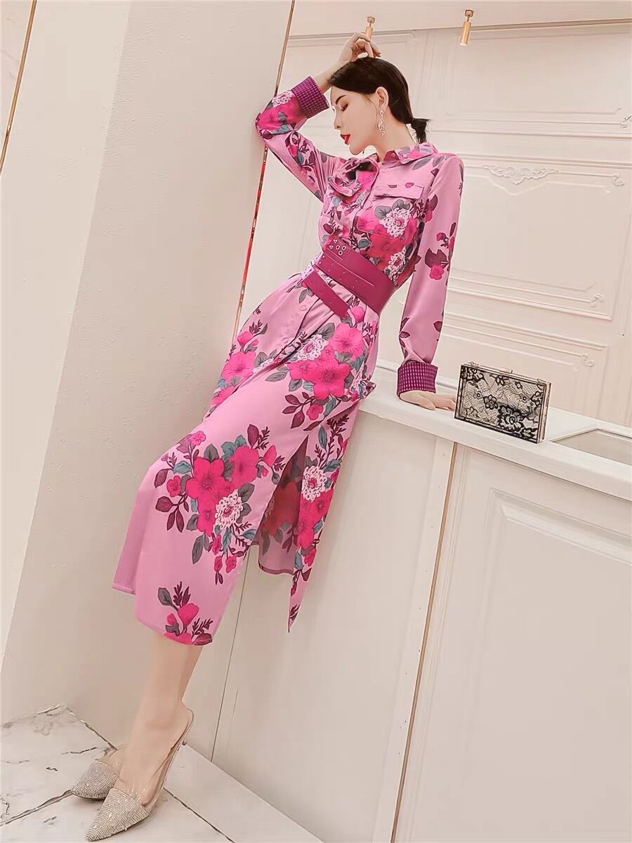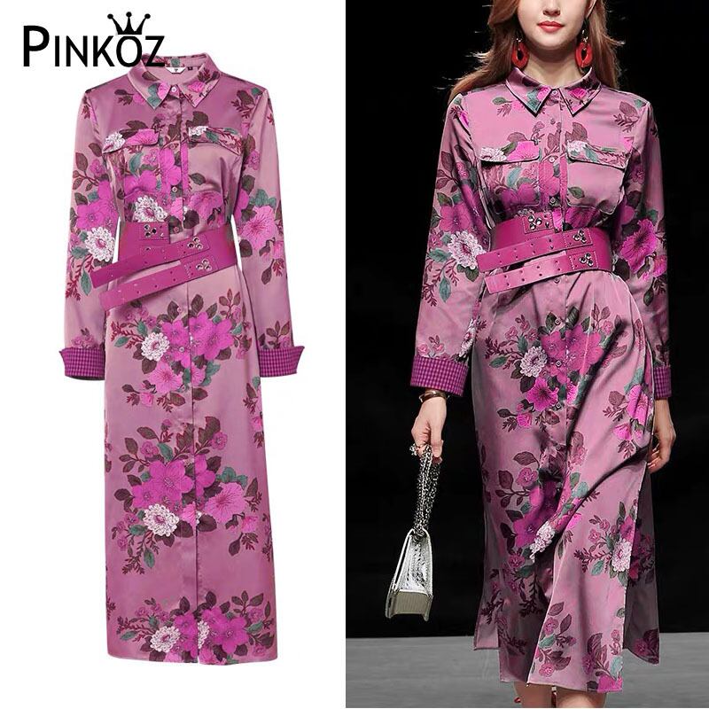 Pinkoz 大きいサイズのコルセット ロング スリーブ ミディ パープル ドレス フラワー ストリート レトロ ドレス プリント フローラル ドレス ベルト ピンク 長袖 大きめサイズ ハーネス 花柄 フラワーデザイン