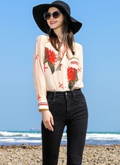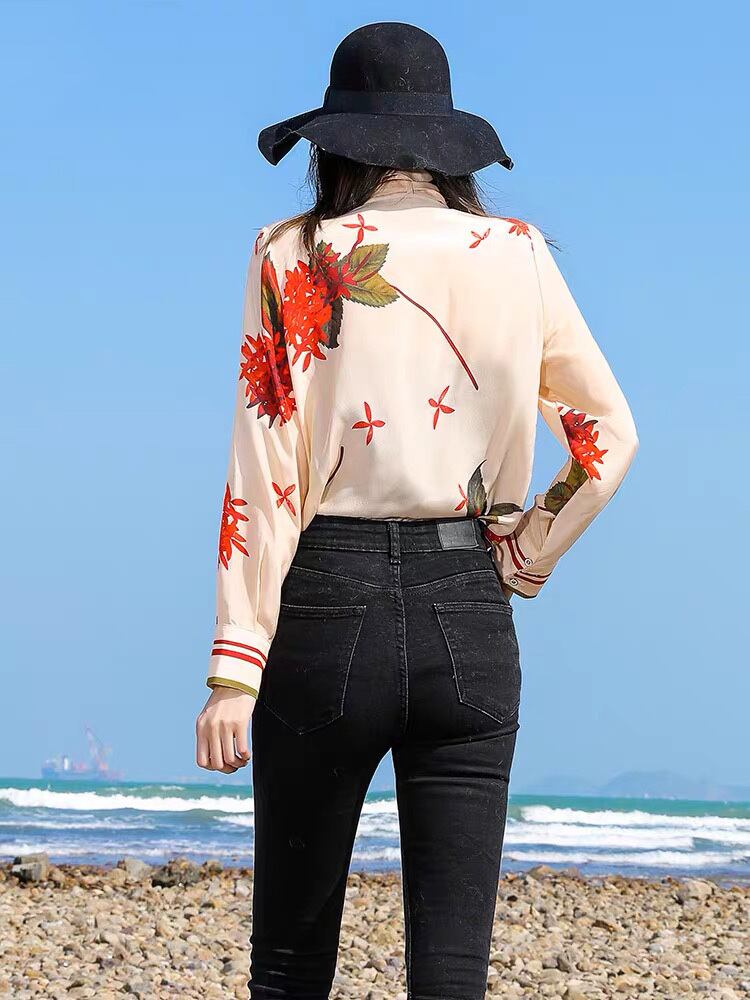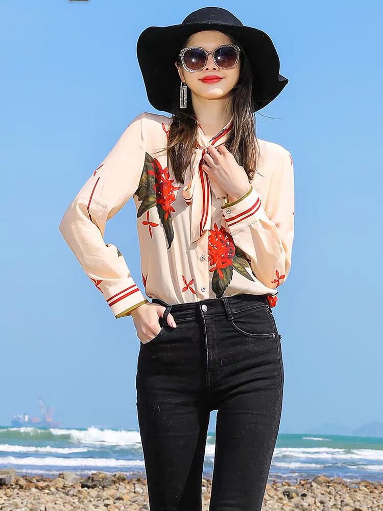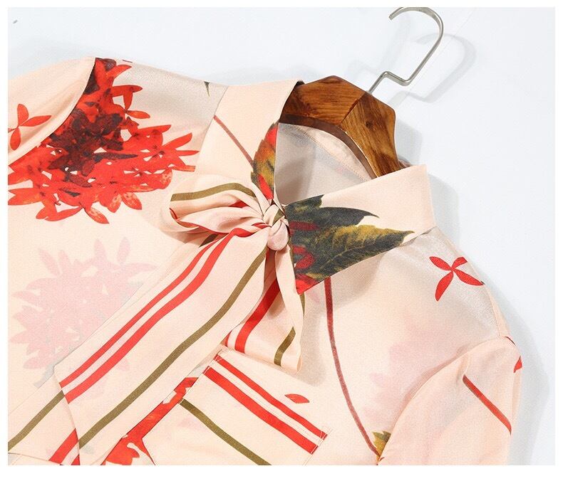 Pinkoz デザイナー スタイル赤い花プリント ボウ カラー ヴィンテージ新しいレースアップ長袖オフィス レディー シャツ花柄ブラウス トップス ファッション ロング ピンク レッド リボン フラワーデザイン ビンテージ 会社 学校 通勤や通学にも