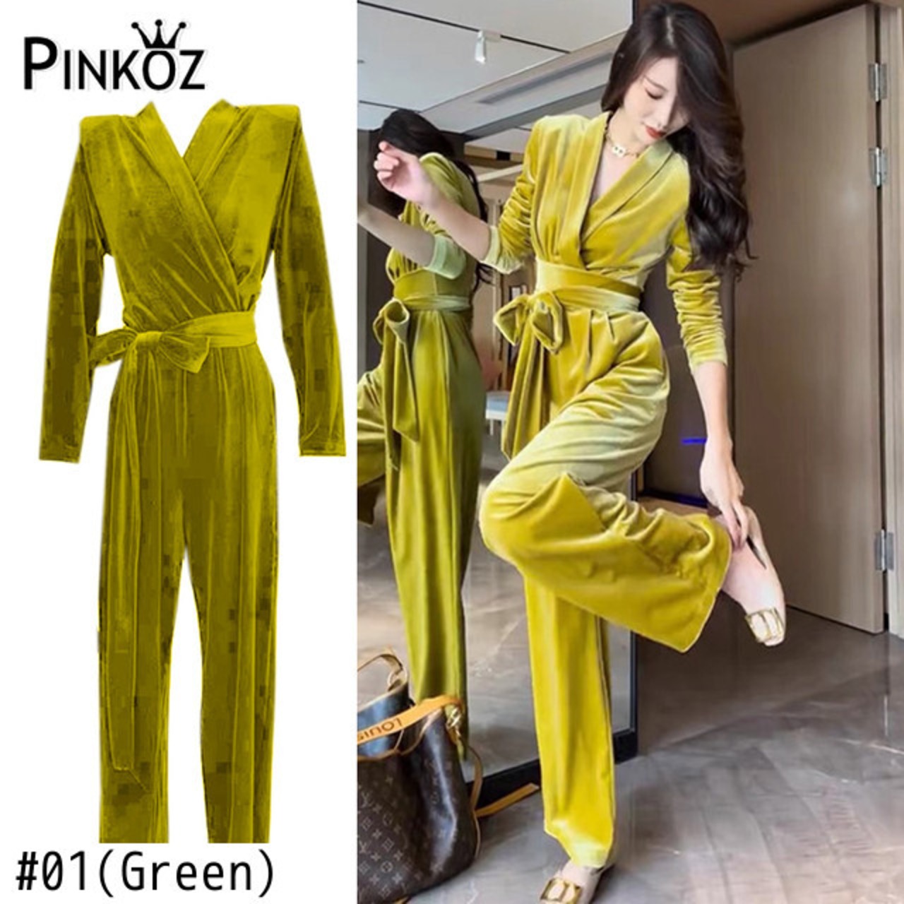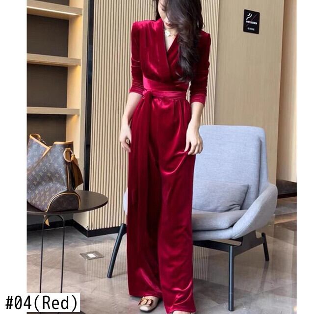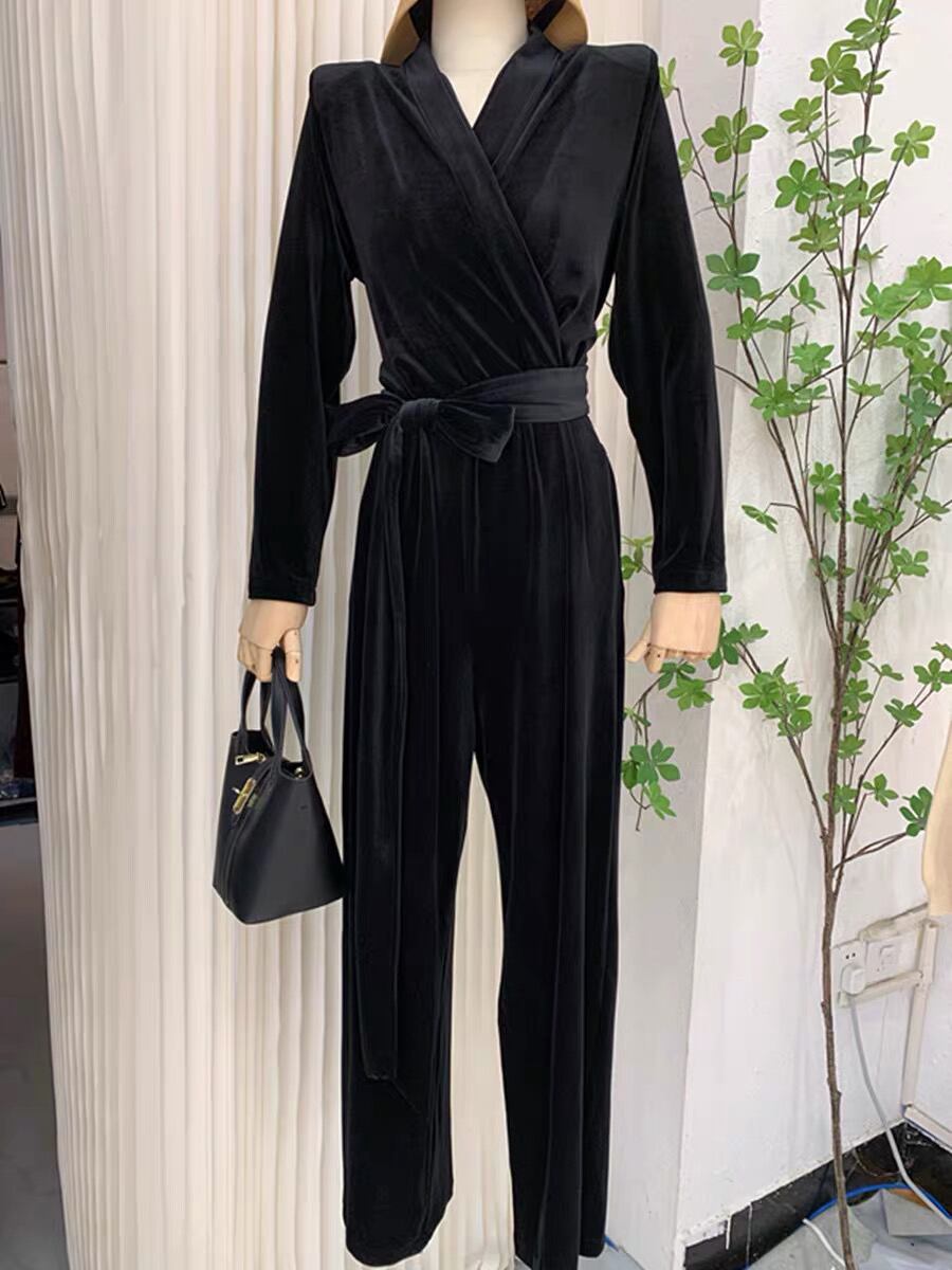 Pinkoz 女性エレガントな冬服ベルベット v ネック長袖ぬるぬるジャンプスーツオフィスレディハイウエストレースアップシックなロングパンツ za ハイウェスト ピンク ウィンター 冬物 Vネック 会社 学校 通勤や通学にも