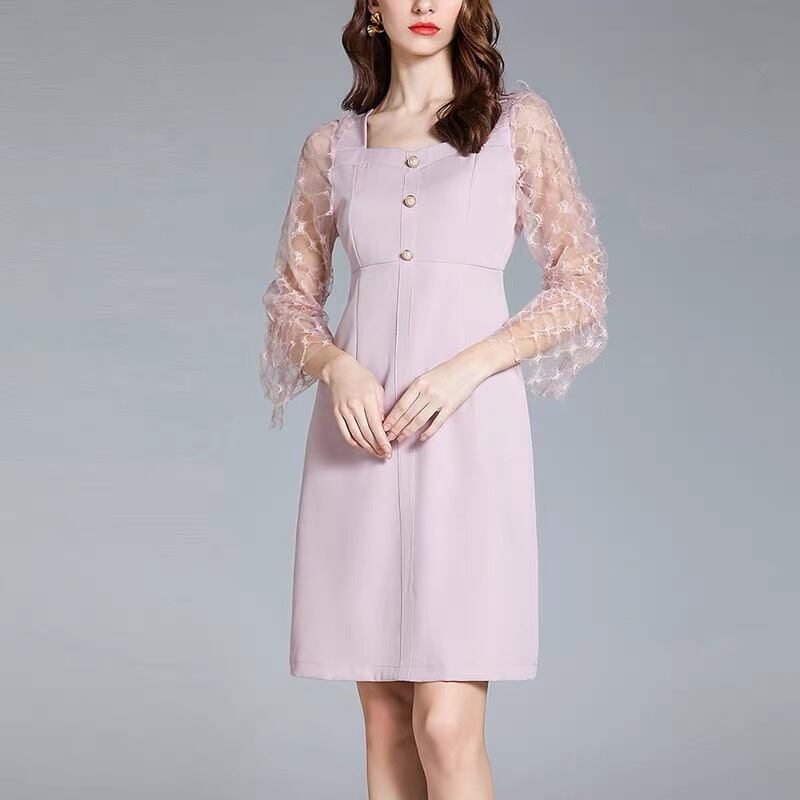 Pinkoz 女性ボタン パッチワーク レース フレア スリーブ甘いかわいいファッション ドレス ヴィンテージ フレンチ レディー ピンク ペンシル ドレス パーティー vestidos フレアスリーブ 大人ガーリー スウィート キュート カジュアル ビンテージ