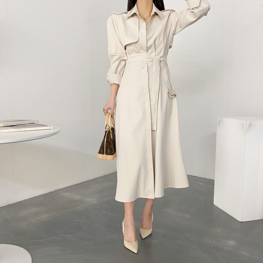 Pinkoz 韓国ファッション ベージュ トレンチ ロング ボタン ミディ ドレス ベルト付き 春 秋 エレガント オフィス レディ ストリート カジュアル トラフ ピンク スプリング 春物 オータム 秋物 ハーネス 会社 学校 通勤や通学にも