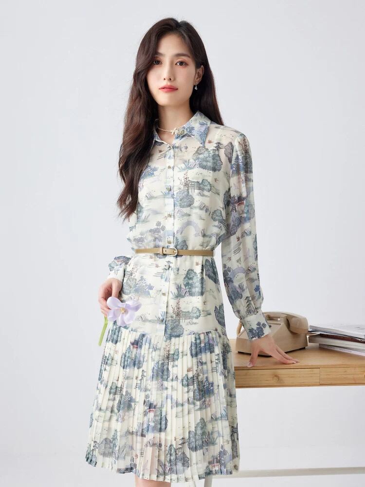 Pinkoz 2 ピース セット女性ミディ ドレス グレー植物花柄ターン ダウン襟長袖パッチワーク プリーツ ヴィンテージ ドレス ロング ピンク ビンテージ
