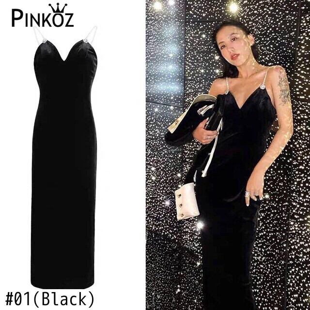 Pinkoz 女性ドレスベルベットクリスタルボタンストラップミディドレススリットボディコンセクシーなストリートパーティーサマードレス z ピンク 夏物