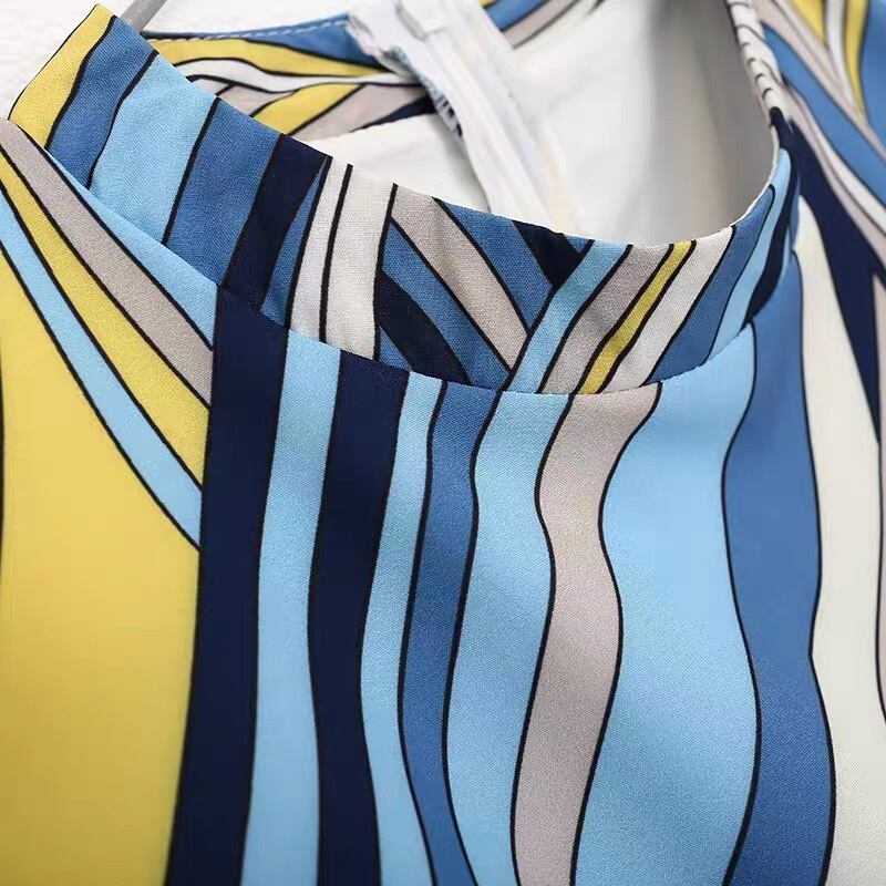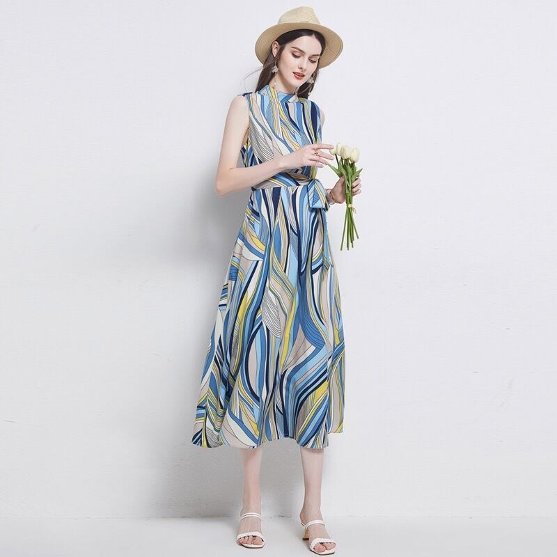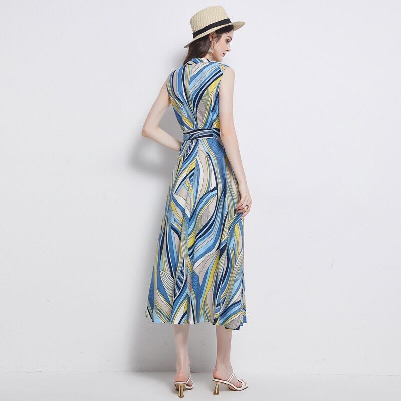 Pinkoz デザイナー スタイリッシュなブルー ハンド塗装プリント ノースリーブ マキシ ドレス自由奔放に生きるホリデー ルーズ ドレス サッシ レース アップ vestidos シック ピンク レースアップ
