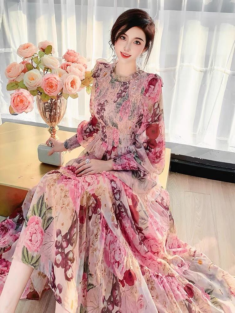 Pinkoz 滑走路デザイナー花柄シャーリング スタンド カラー A ライン弾性マキシ ドレス女性ホリデー シックなローブ デ mujer traf ピンク エラスティック 伸縮 Aライン