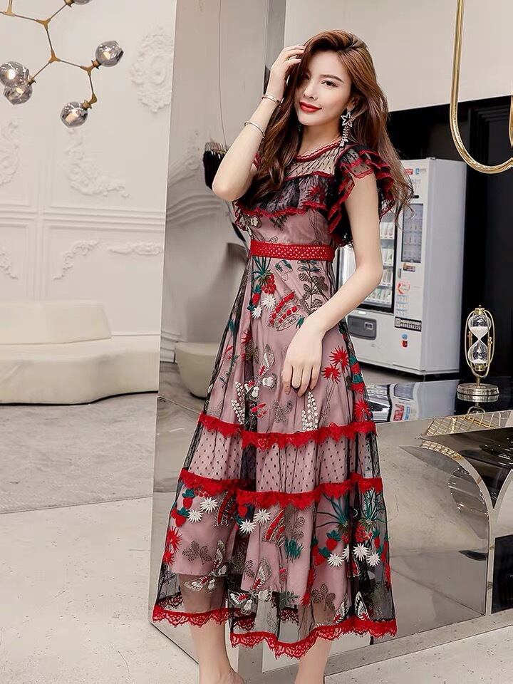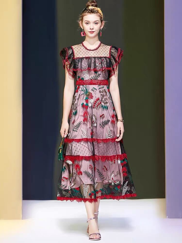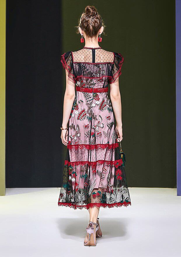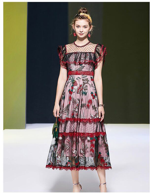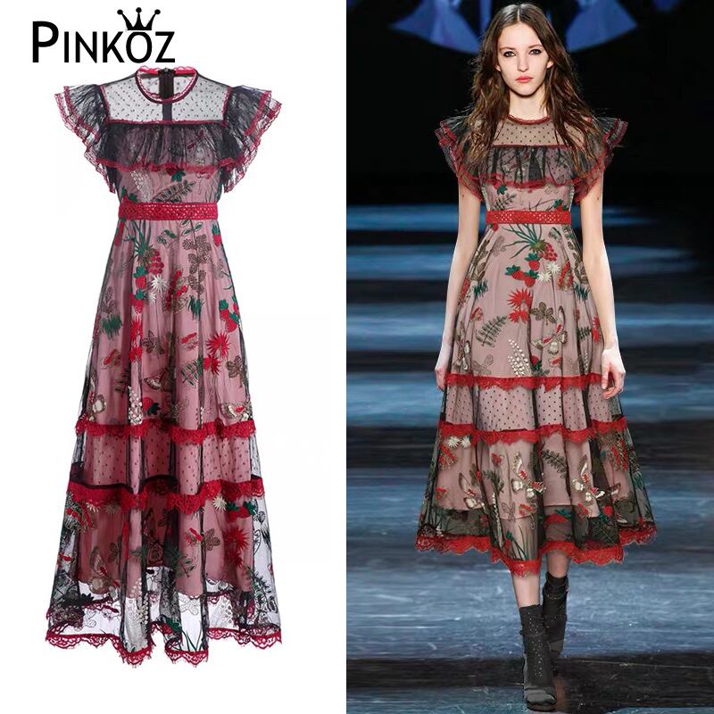 Pinkoz 滑走路夏メッシュドレス女性のレースのパッチワーク刺繍高級シックな休暇ビーチミディドレス vestidos ピンク サマー 夏物